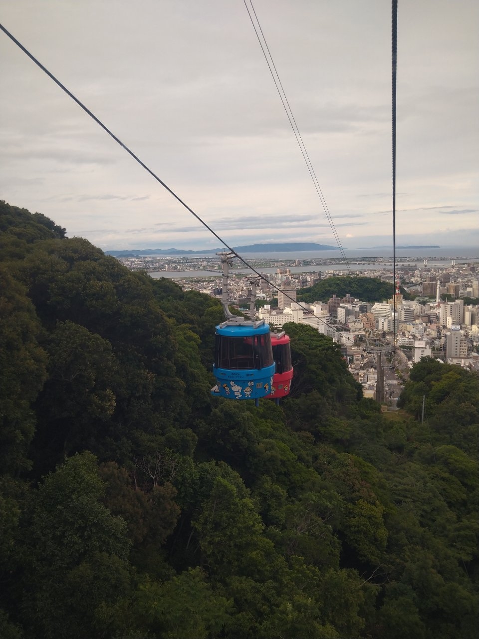 2機で移動するロープウェイです。ロープウェイ独特の揺れが少なく(※風があまりなかったせいかもですが)、4分で山頂まで着きます。ロープウェイ内では、眉山関連のご当地ソングが流れているので、こちらもお勧めです。