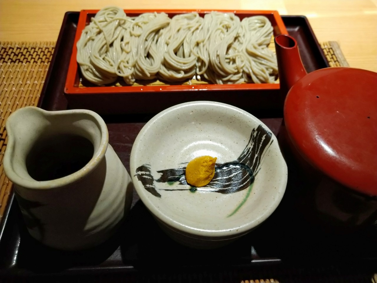 へぎそばが食べたい気分で訪れました。最初はお酒とおつまみを少しいただいてからの、〆のへぎそばです。へぎそばの薬味はからしなんですね。以前に行ったお店とはまた違う薬味でしたが、へぎそばによく合っていました。