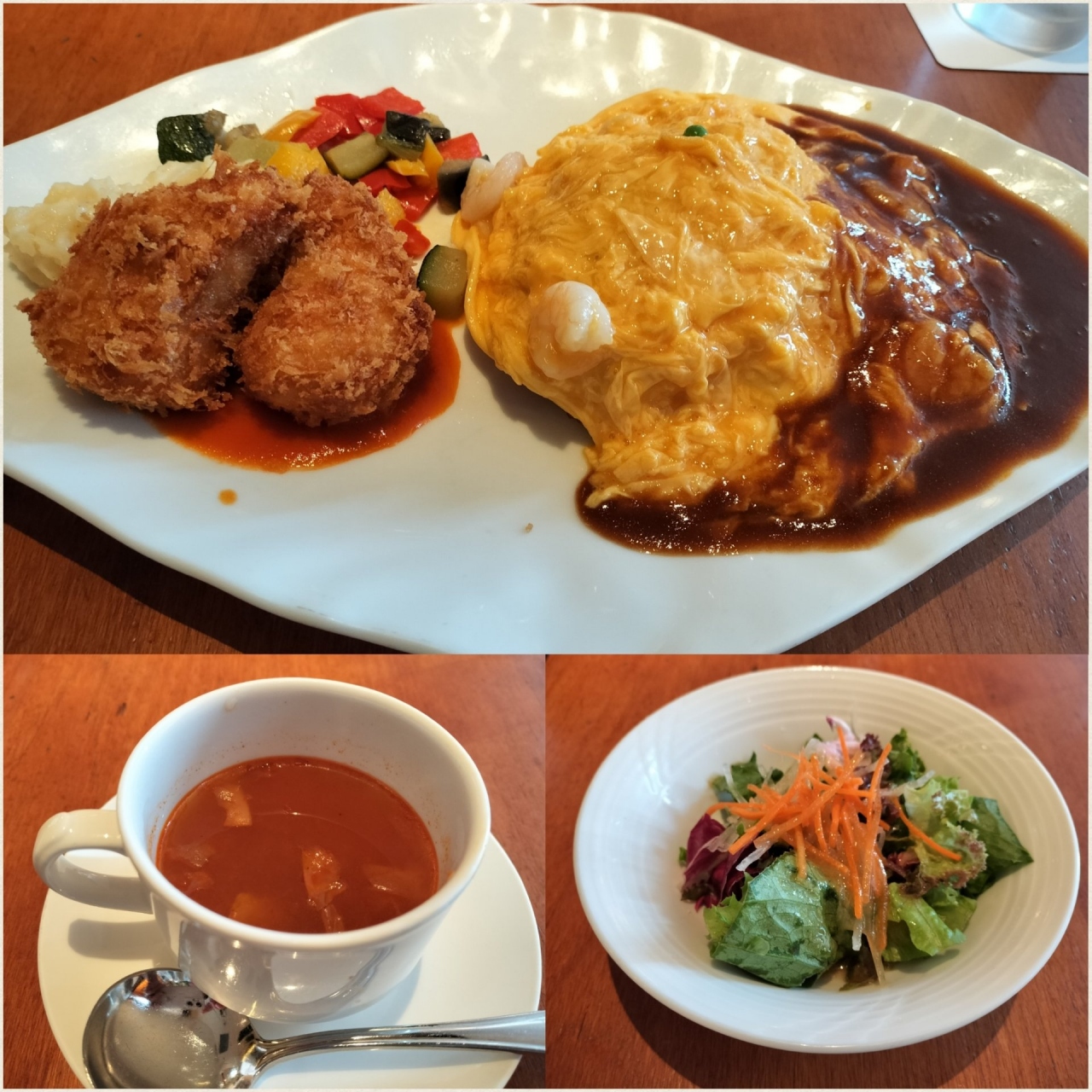 日本橋三越百貨店の「グリル満天星」さんを訪れました。”選べる洋食”で、オムライスとカニクリームコロッケを選択。ランチには、サラダとスープが付いてきます。どれも美味しかったですが、、、オムライスのご飯は、チキンライスではなく薄くスライスされた椎茸が入っていていました。個人的に椎茸が苦手なので、これには参りました(;'∀')