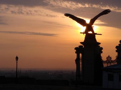 ケーブルカー駅横の王宮入り口からみる朝焼けのペストの街並。