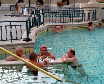 セーチェニ温泉名物の風呂チェス。タイルにチェス版がセットしてあるとばっ...