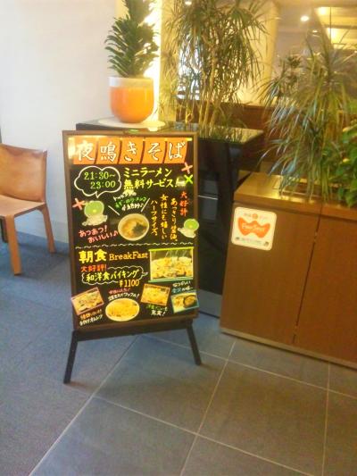 21時半より宿泊者には「夜鳴きそば」の無料サービスがある。しょう油系のミニサイズのラーメンだが一階の朝食ビュッフェの会場で供される。