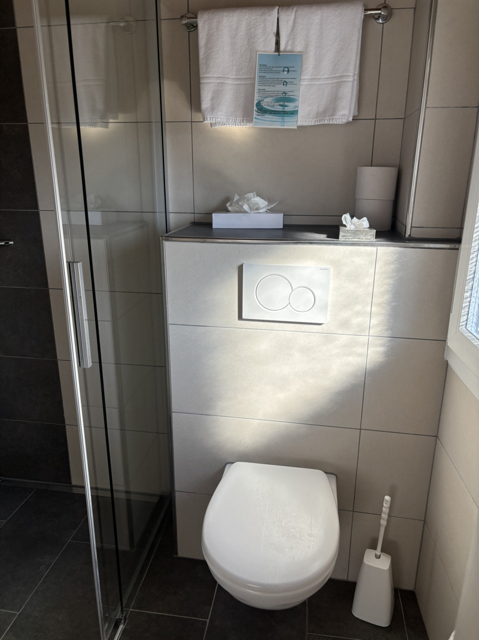 シャワーブースは普通のスペースで、横にトイレ。ティッシュペーパーもありました。
