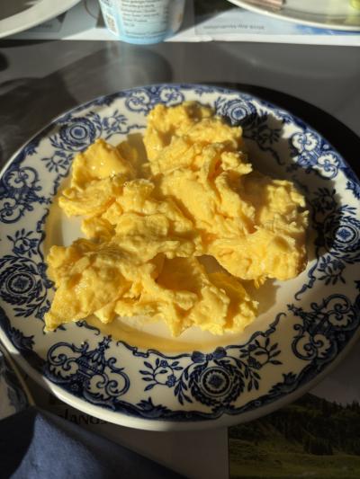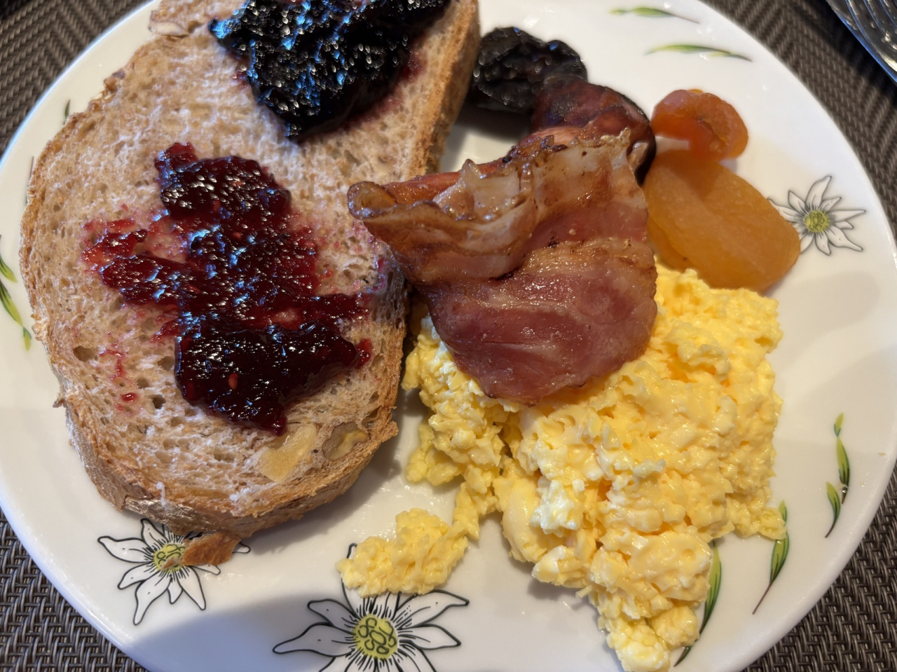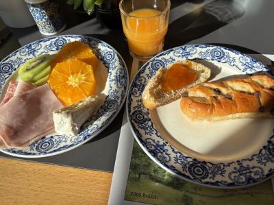 朝食付きでした。果物・チーズ・ハムなどありましたし、卵料理はリクエストでアレンジして下さって、お願いしたスクランブルエッグが多くて食べきれなくて、申し訳なかったのです。夫は食べきりましたが・・