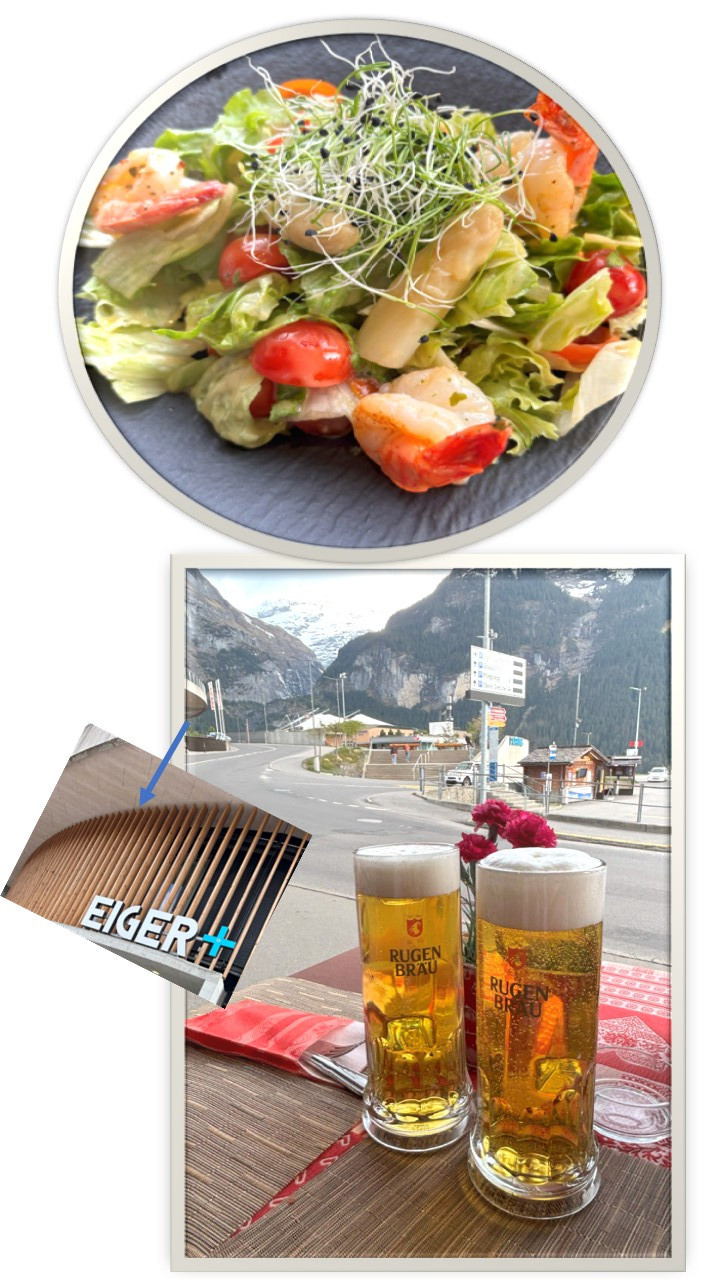 1階にはレストランが併設されていて、私達は夕食は近くのCOOPで調達した料理で済ませましたが、その後にレストランの外テラスで、アイガーを望みながら、季節の白アスパラのサラダとビールを楽しみました。