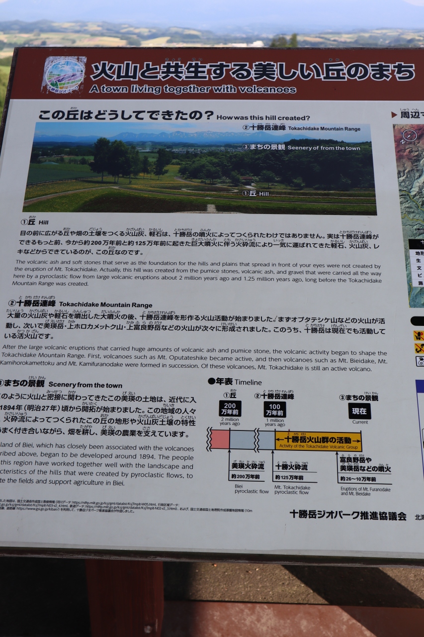 美瑛の丘は十勝連峰が出来るもっと前、今から200万年前(美瑛火砕流)と、約125万年前(十勝火砕流)に起きた巨大噴火に伴い、一気に運ばれた軽石、火山灰、レキから出来ているんだそうです。