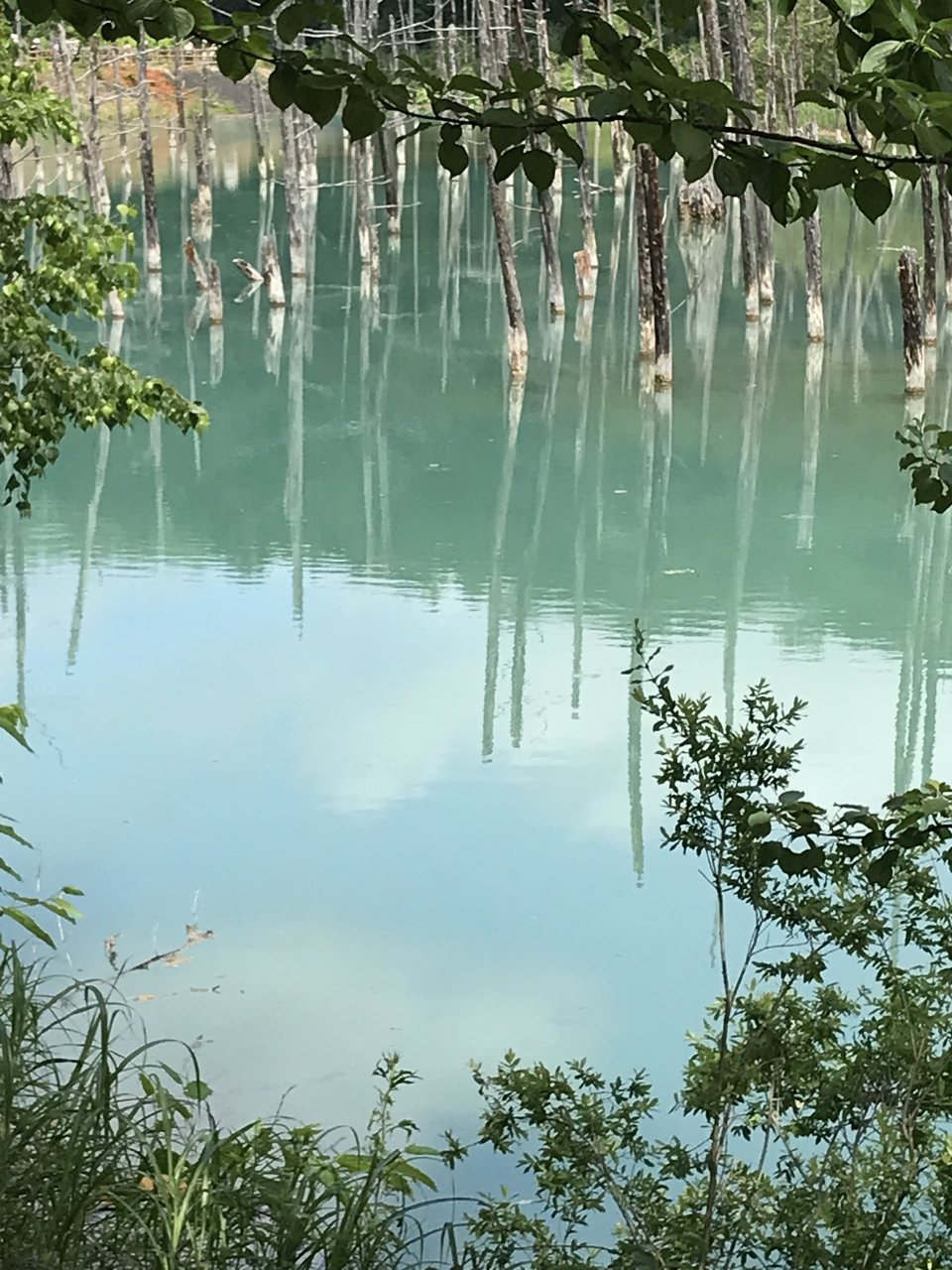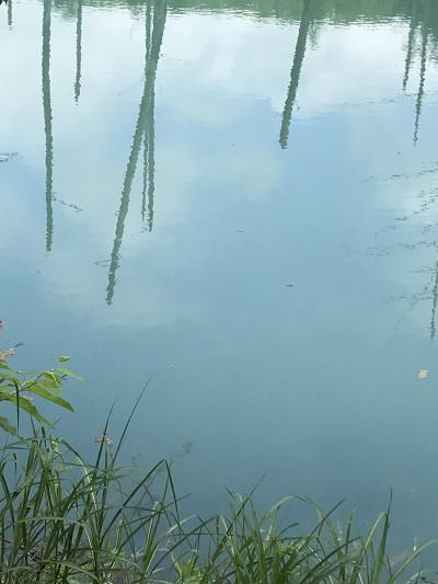 そぞろ歩きに良い一歩通行の道の横に広がるブルーの池。やっぱり晴れてほしいですね