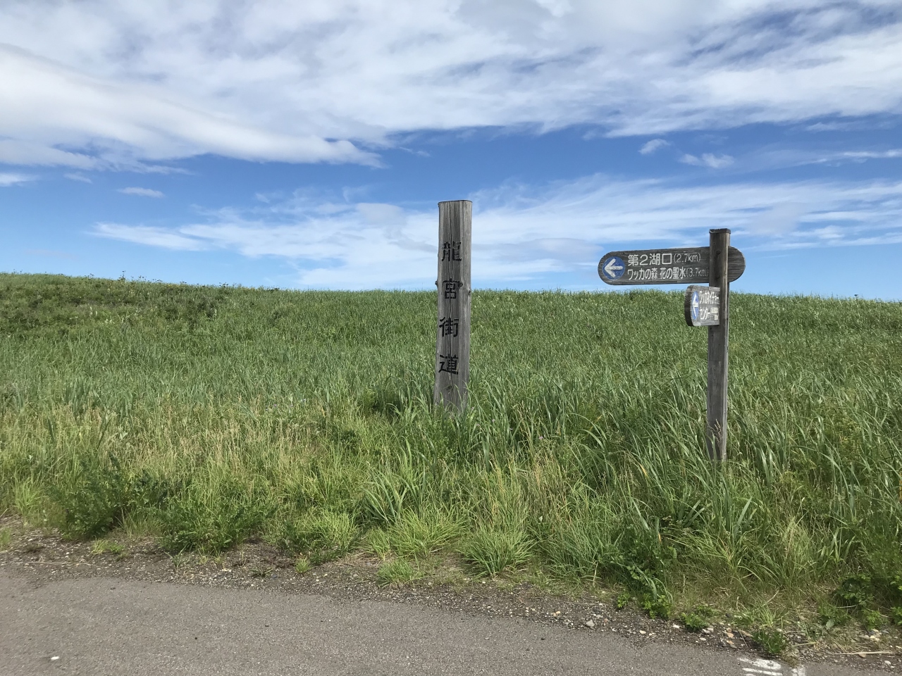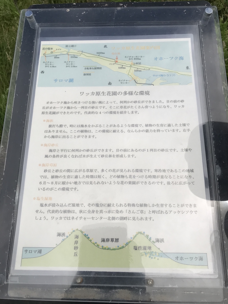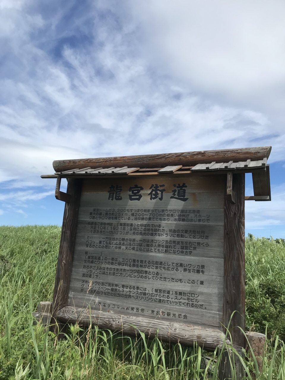 その説明板には、東京ドームが3300もすっぽりはいってしまうサロマ湖は、北海道最大の湖で長さ25キロ、幅200~700メートルの細長い砂州が、オホーツク海とサロマ湖を隔てている。地平線の果てでもあり、水平線のはじまりでもある、この砂州は「龍宮街道」と呼ばれている。