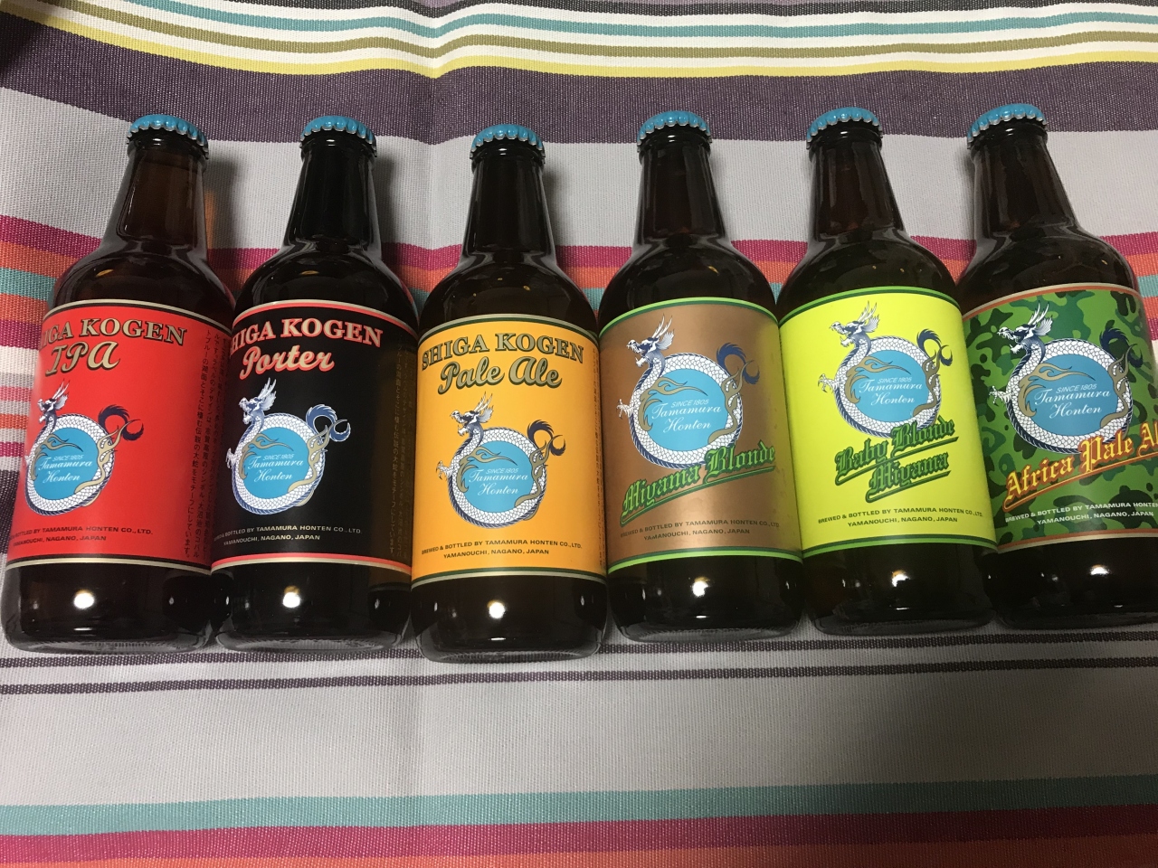 「志賀高原ビール6本」人気の志賀高原ペールビール・志賀高原IPA・志賀高原ポーター(黒)・Africa Pale Ale・Baby Blonde Miyama・House IPAの6本購入。