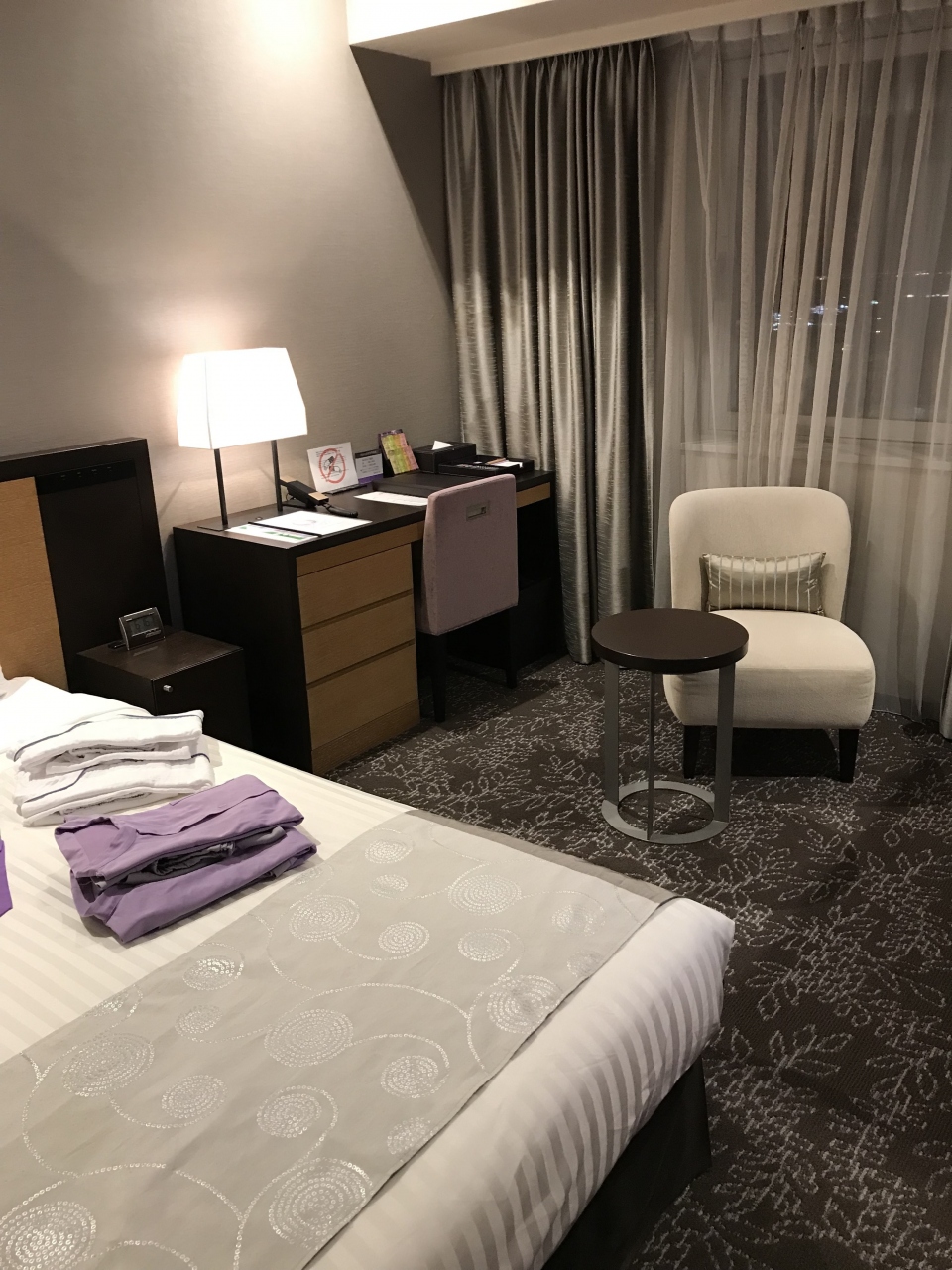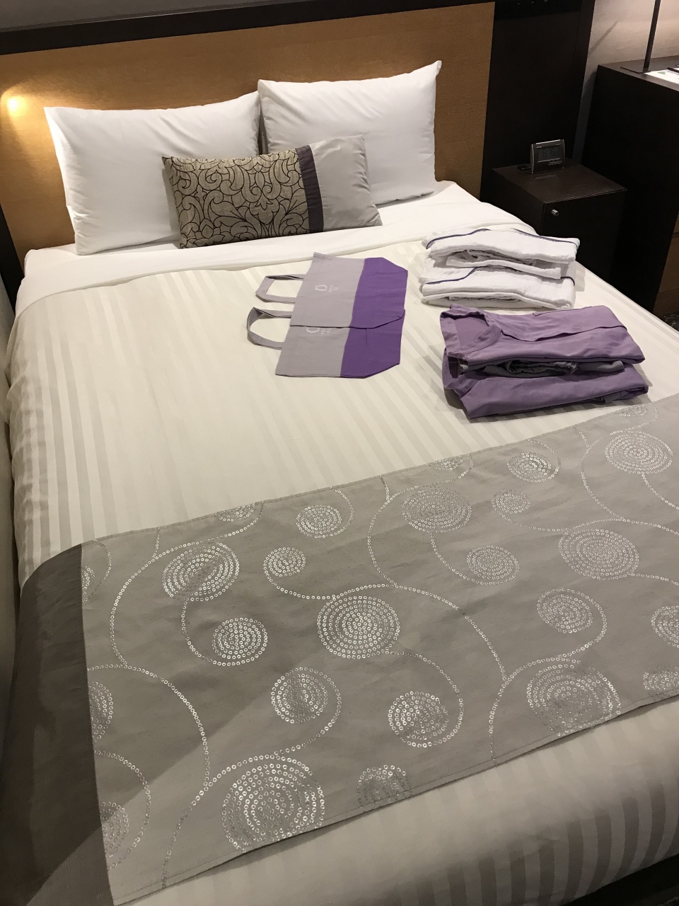 部屋着2種類ありまして白は部屋のみ。紫は館内着・スリッパの利用が出来ますと記載されていて、大浴場・朝食会場・ラの5階フロアーまではOKだそうです。