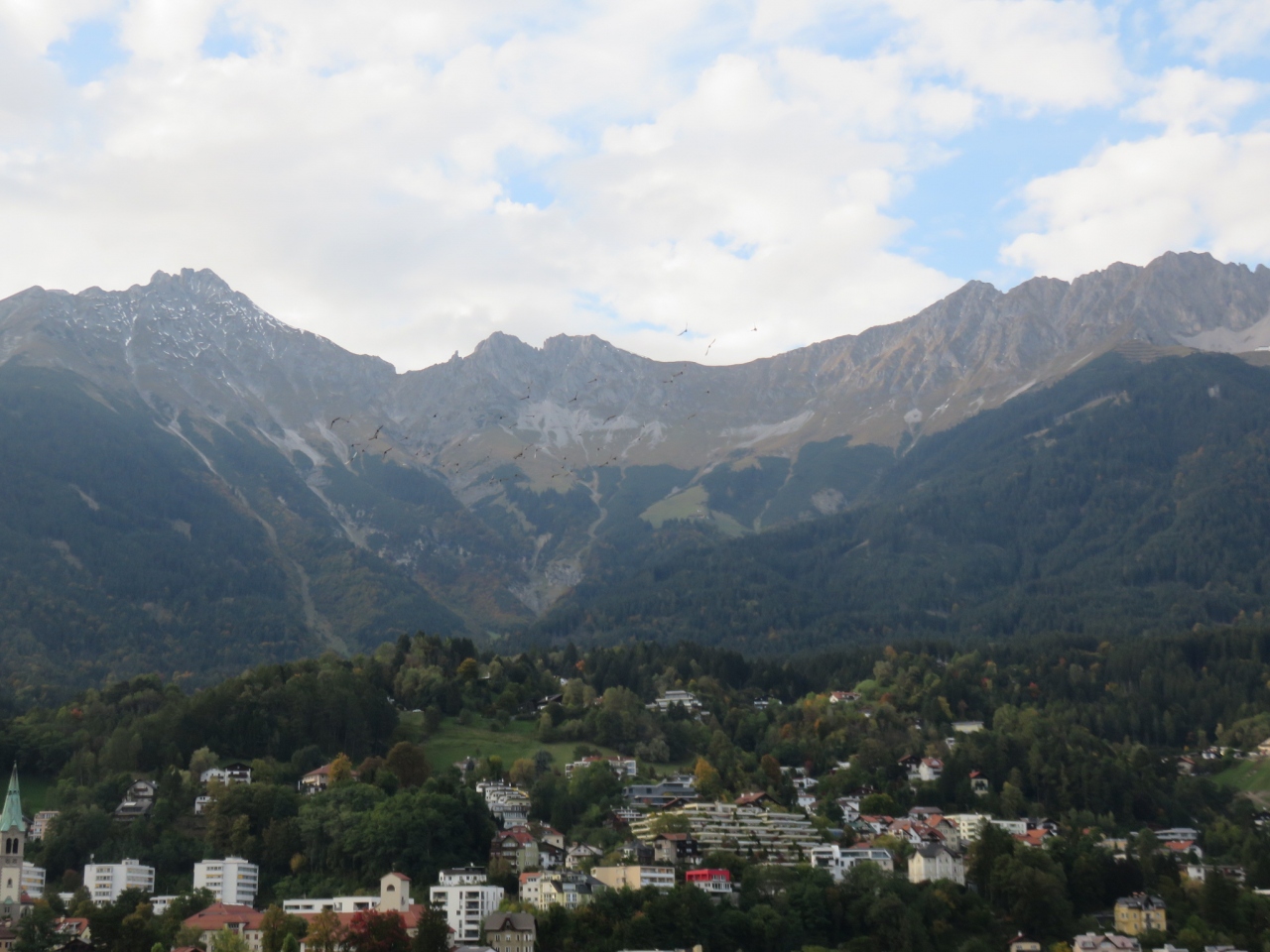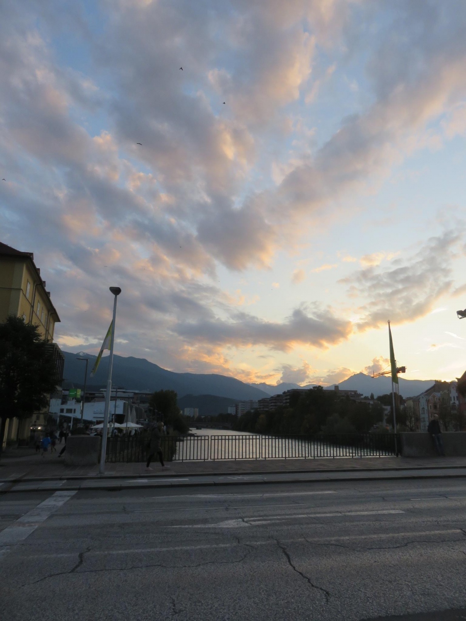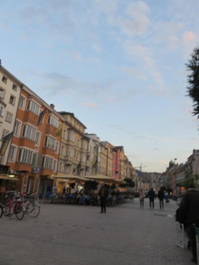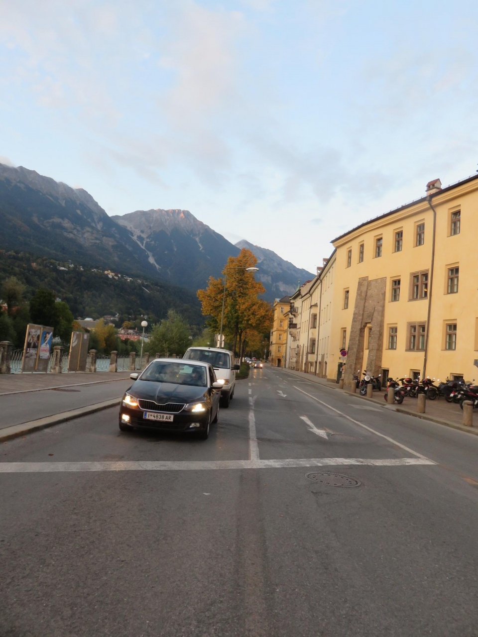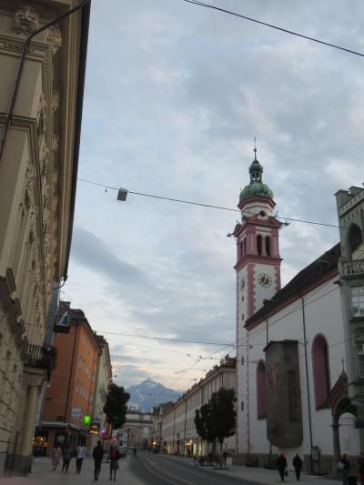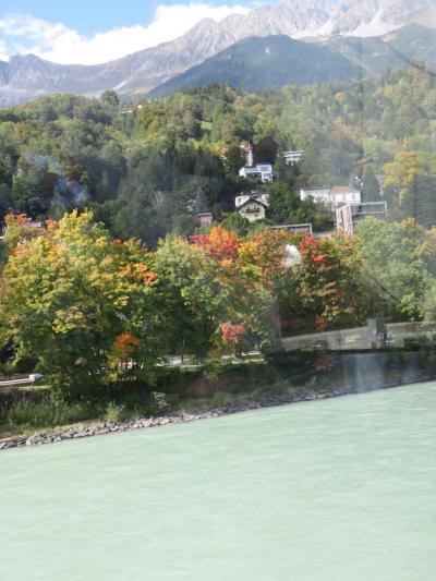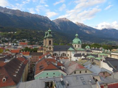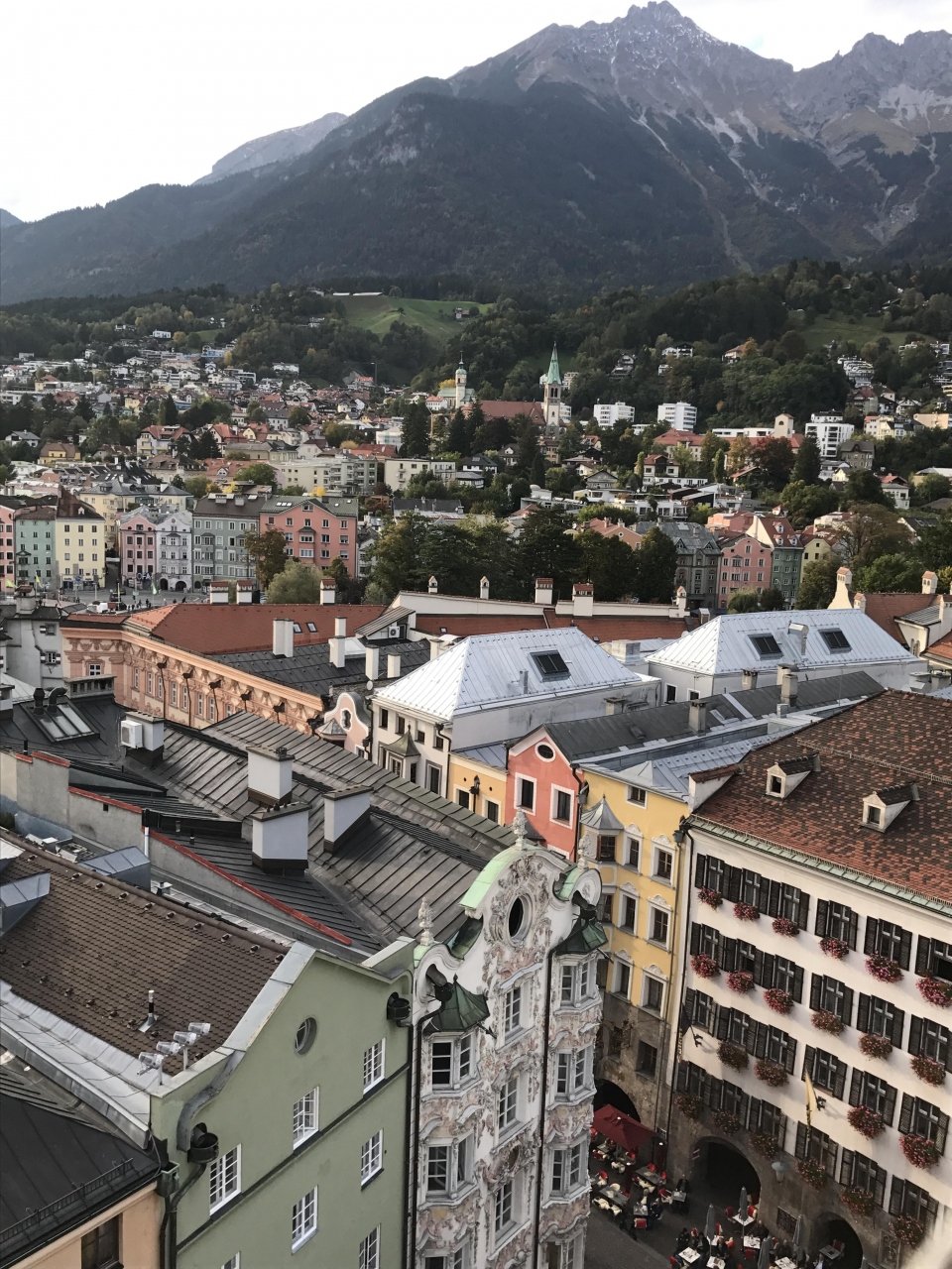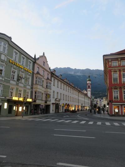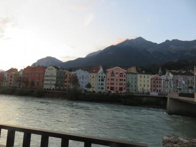 訪問時間が夕方になってしまいましたが、9月後半でもまだ明るいのでインスブルックの山とイン川・それに沿うようにカラフルな建物が見れました。