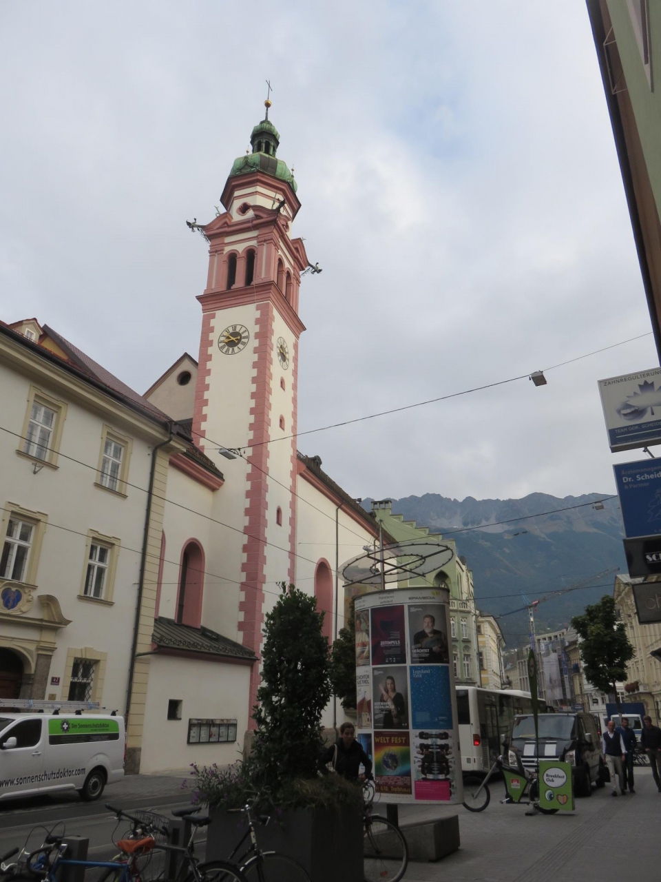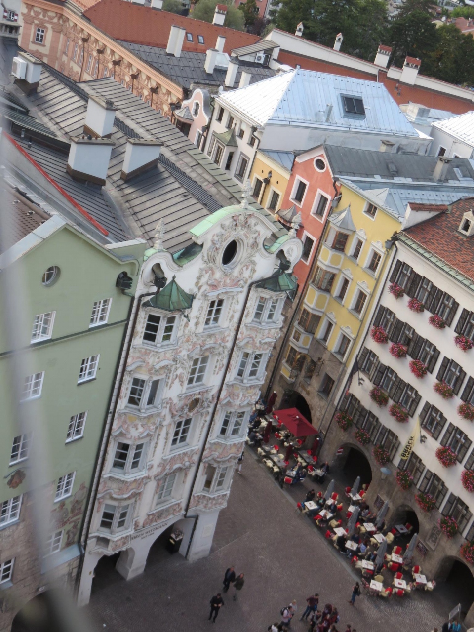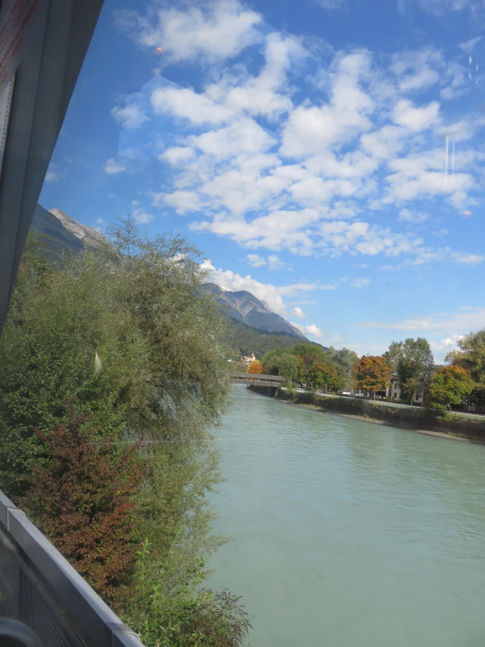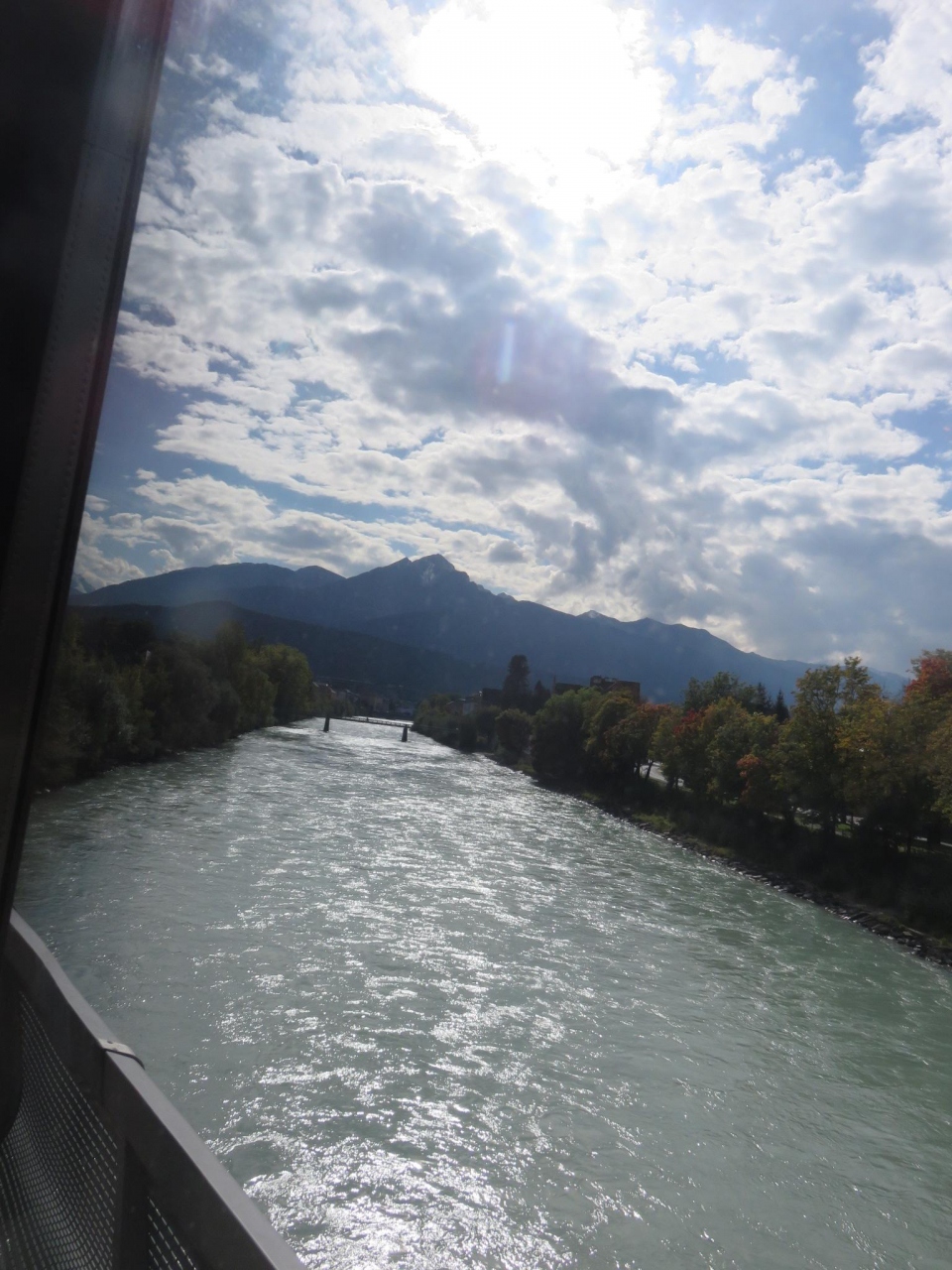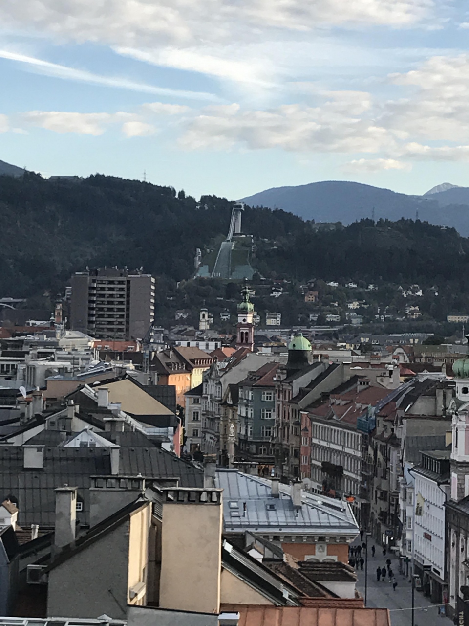 訪問時間が夕方になってしまいましたが、9月後半でもまだ明るいのでインスブルックの山とイン川・それに沿うようにカラフルな建物が見れました。