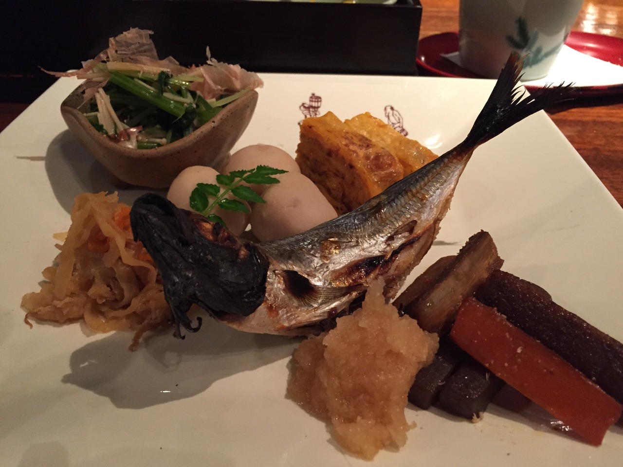 魚は苦手ですが、炭火で焼いてくれた一夜干し・根菜類の惣菜・味噌汁など9品で1300円のランチは40膳の限定です。