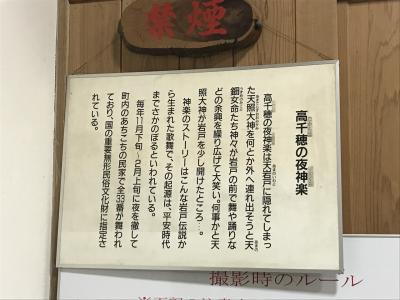 高千穂の夜神楽の説明が壁に掲げられいますし、観光協会発行の説明文も頂けますので、舞の事は理解できます。