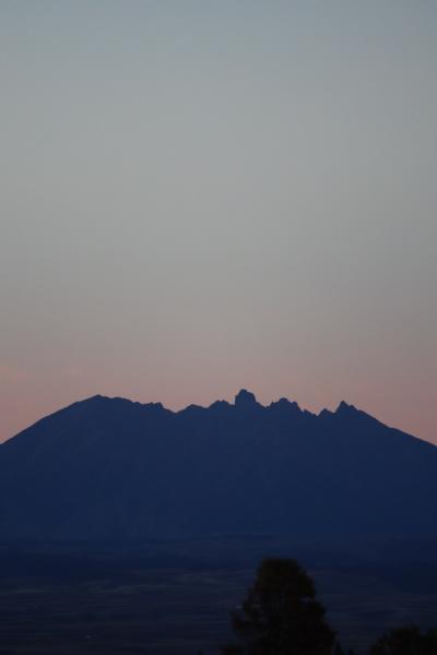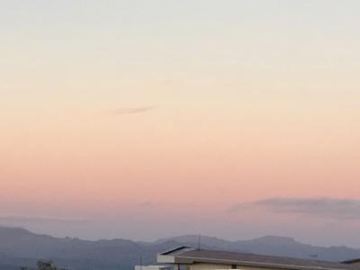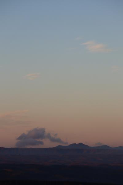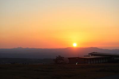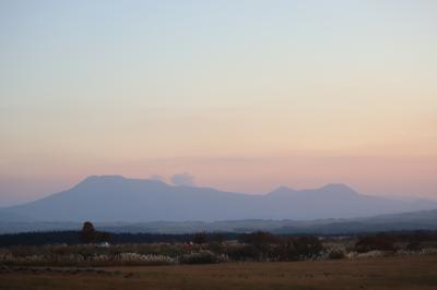 夕刻に夕日・パステルカーラーに染まった朝焼け。遠くに中岳の噴煙が見て、五岳の山並みが連なり、明け方の濃霧も見事で感動致しました。