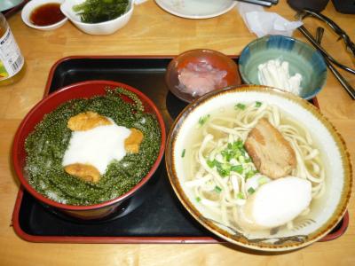 私は、海ぶどう丼と沖縄そばのミニミニ丼を食べました。本来は真ん中にイク...