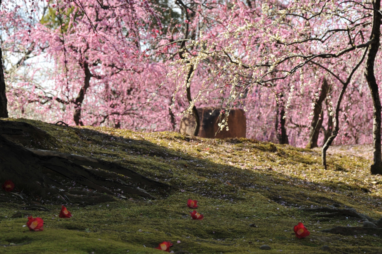 すごい。ここの梅はすごい。これまでいくつかの梅園を見てきたが、城南宮が最高だった。特に枝垂れ梅だ。ここの枝垂れ梅を見てしまうと、通常の上向きに咲く梅がスカスカに見えてしまうから不思議だ。ピンクの花があられのごとく、シャワーのごとく降り注いでいる。花々は空間を埋め、緑苔を飾り、椿と共演する。見る人の歩みがなかなか進まないほどの梅園だ。場所は京都南インター第二出口からすぐ。この日は土曜日で、現地には午前8時半に着いたが、駐車場は余裕だった。ただ、9時の開園頃になると車が増え、帰途に就いた10時半ごろには広大な駐車場が満車だった。8時半に着いたときは梅園の中に入れなかったが、道路反対側の「おせきもち」は開店しており、銘菓を食べながら開園を待った。