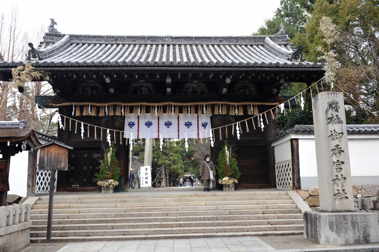 福岡民謡の黒田節。「酒は飲め飲め飲むならば、日の本一のこの槍を、飲みとる程に飲むならば、これぞ誠の黒田武士」。1596(文禄5)年正月、賤ケ岳の七本槍とたたえられた豊臣家の武将・福島正則の邸宅で酒宴があり、黒田長政は家臣の母里太兵衛を出席させた。酒乱の正則を恐れ、長政は太兵衛に飲酒を禁じていたが、正則から「これを飲めば望みの品を与える」と大きな鉢に注いだ酒を勧められ、ならばと秀吉拝領の名槍「日本号」を所望し、飲み干して槍を得た。この槍は「呑み取りの槍」とも称され、太兵衛は朝鮮出兵でこの槍で手柄を立てたという。黒田節は昭和時代にレコード化され、国民の間に広がった。説明版は御香宮神社の塀の前にある。