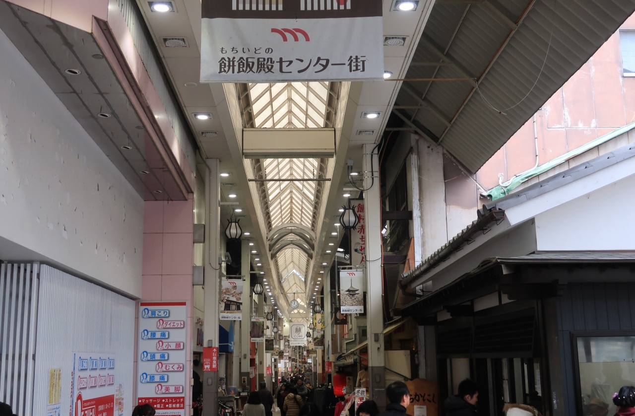 「もちいどの」はこのあたりの地名を商店街の名称に採用しているが、漢字で書くと「餅飯殿」と難読だ。近鉄奈良駅から東向商店街を通過し、三条通からならまちに向かうアーケード商店街。三条通りに面した入口付近の「中谷堂」が有名で、店頭で実演される高速餅つきを見ようと、見物客であふれている。全般的には少しレトロな感じもするが、味わい深い飲食店、ショップも多い。