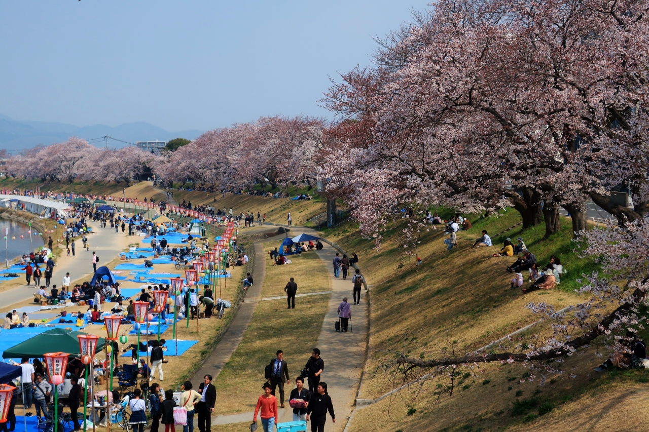 岡山市に春らんまんを告げるイベントだ。後楽園と書いてあるが、どちらかといえば旭川の堤防と後楽園という感じだろう。1.3キロほどの堤防に200本ほどの桜がきれいなラインを描いている。反対側の後楽園では駐車場沿いに樹勢豊かな桜並木が並ぶ。堤防側には露店が多数並び、夜は盛大にライトアップする。昼夜を問わず春を待ちかねたように多くの市民が川辺に繰り出す。ただ、2020年は新型コロナウイルスの影響でイベントそのものは中止になった。