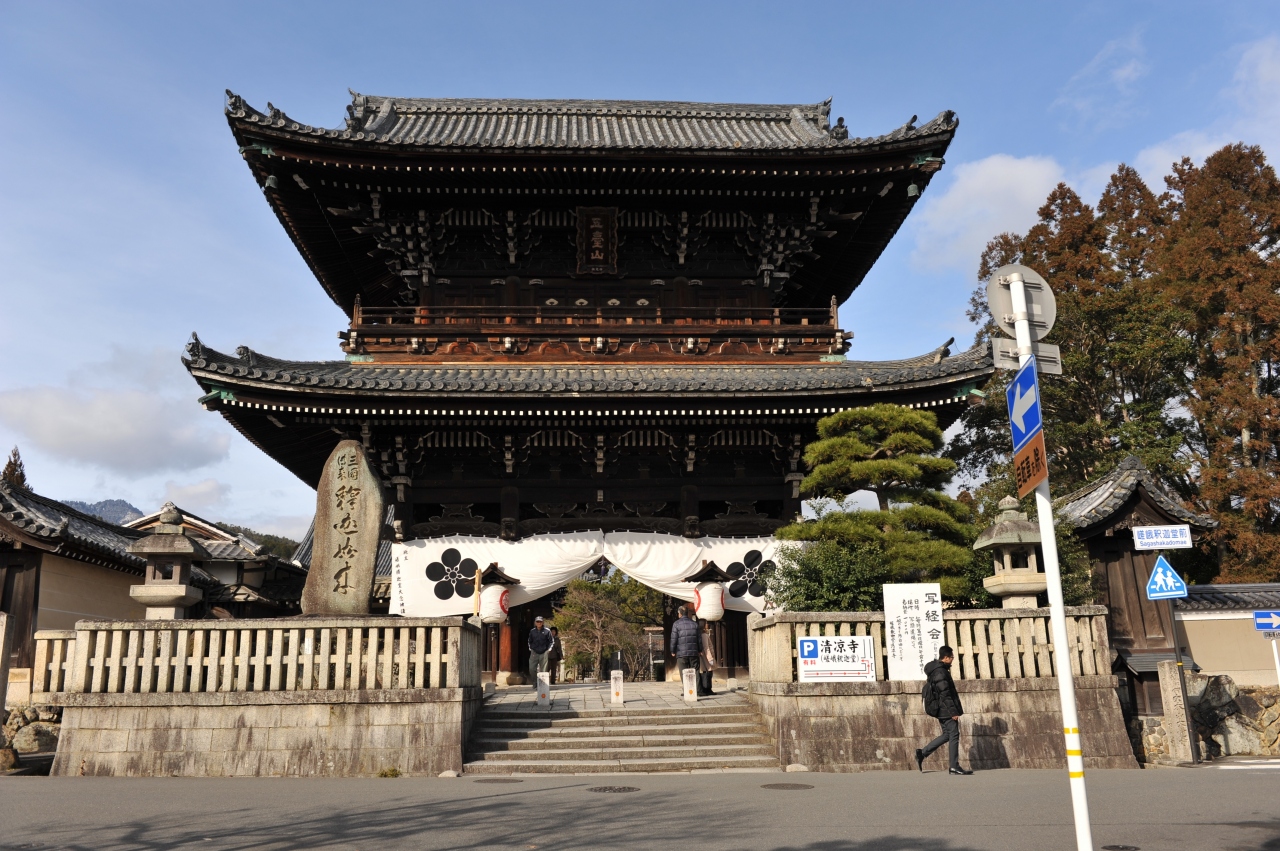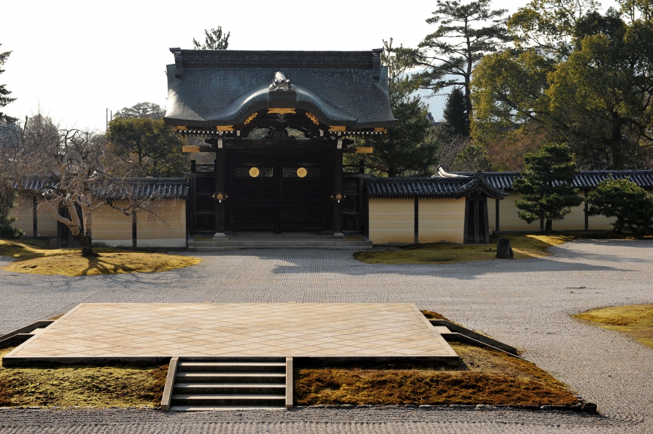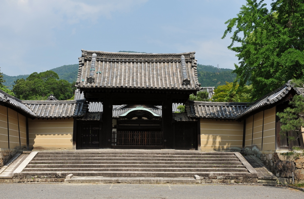 大覚寺の本堂に上がって最初に見える庭の向こうに建つのがこの門だ。ほうき目が見事に入った白砂の庭が広がり、石舞台の向こうに門が見える。江戸時代の建築で、正面の唐破風が印象的だ。大きな菊の御紋が目立つ。さすがは勅使がくぐる門だ。