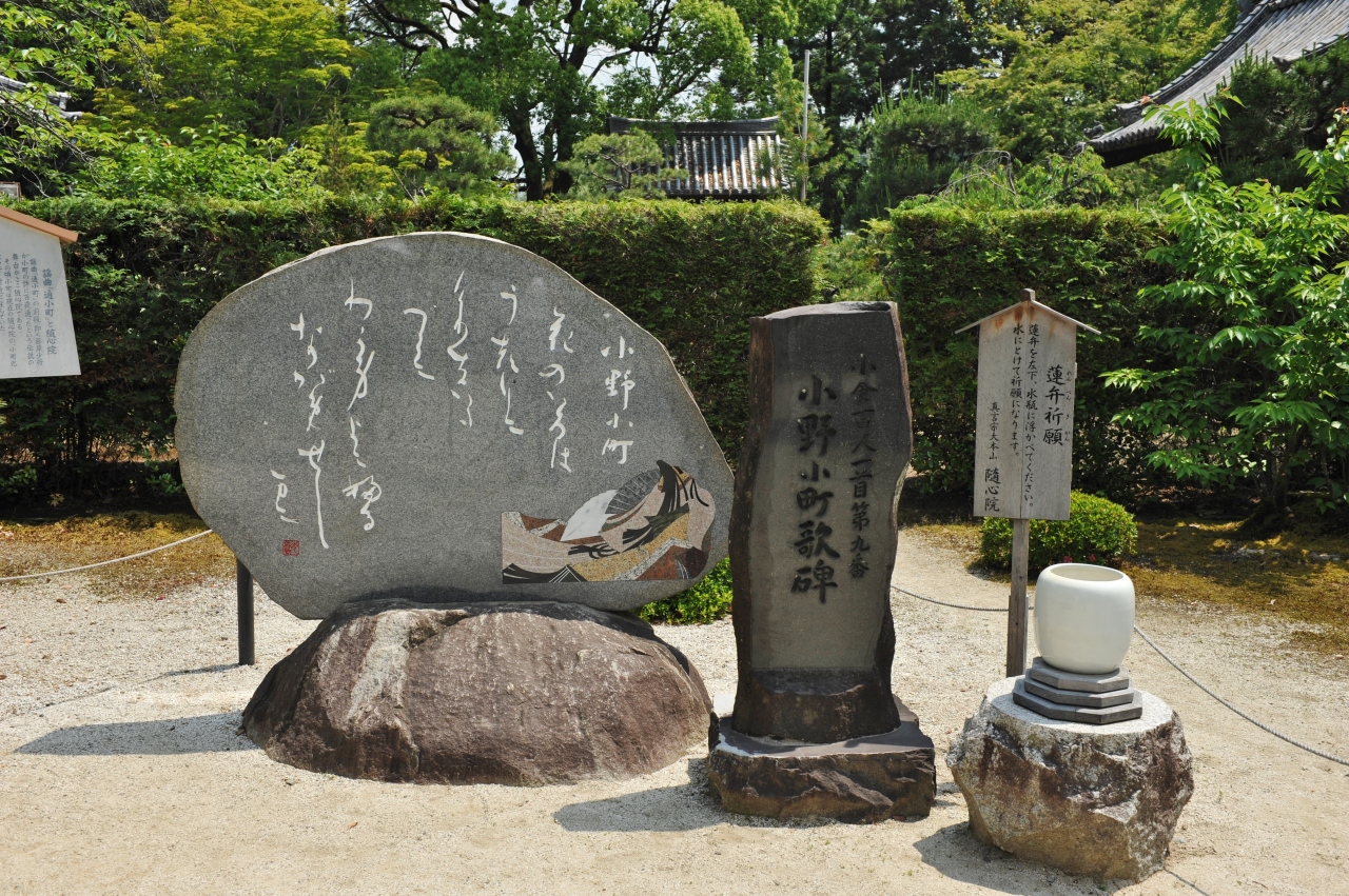 門跡寺院らしい黄土色の筋塀をめぐらせており、風格あるたたずまいだ。古来から一帯の地名は「小野」であり、小野氏一族が栄えた場所だとされる。現地で初めて知ったが、小町はあの小野篁の孫だという。当代きっての文化人・政治家であり、あの世とこの世を行き来できたというスーパーマンだ。さらに書の小野道風のいとこらしい。伝説が残っているのはさもありなん、と思わせる小町の血筋だ。お寺を囲むように小町ゆかりの史跡が残っており、前側には歌碑や梅園、隠遁してから毎日使ったという井戸、「小町庭苑」と名付けられた寺院後背には多くの恋文を埋めたという文塚が散策路に配してある。どことなく女性的な印象があるお寺で、堂内に小町の一生を描いた現代アートの襖絵があるが、ピンク色が基調でとても華やかだ。