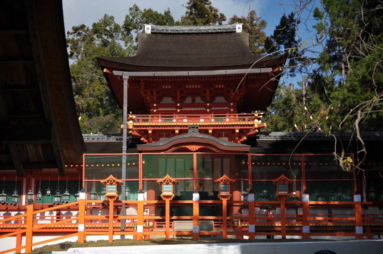 初詣で参拝した。阪急の西院駅から少し歩いた住宅街にあり、あまり広くないが、裏側に駐車場もある。奈良の春日大社を勧請した神社で、大社同様、横に長い朱塗りの社殿が特徴だ。この神社に参拝したことで内親王の疱瘡が治ったという言い伝えがあり、疱瘡を身代わりに引き受けたとされる石が神前に。触れるとご利益があるという。何となくだが、女性の姿が多いような気もした。藤の花をあしらった御朱印帳を購入した。