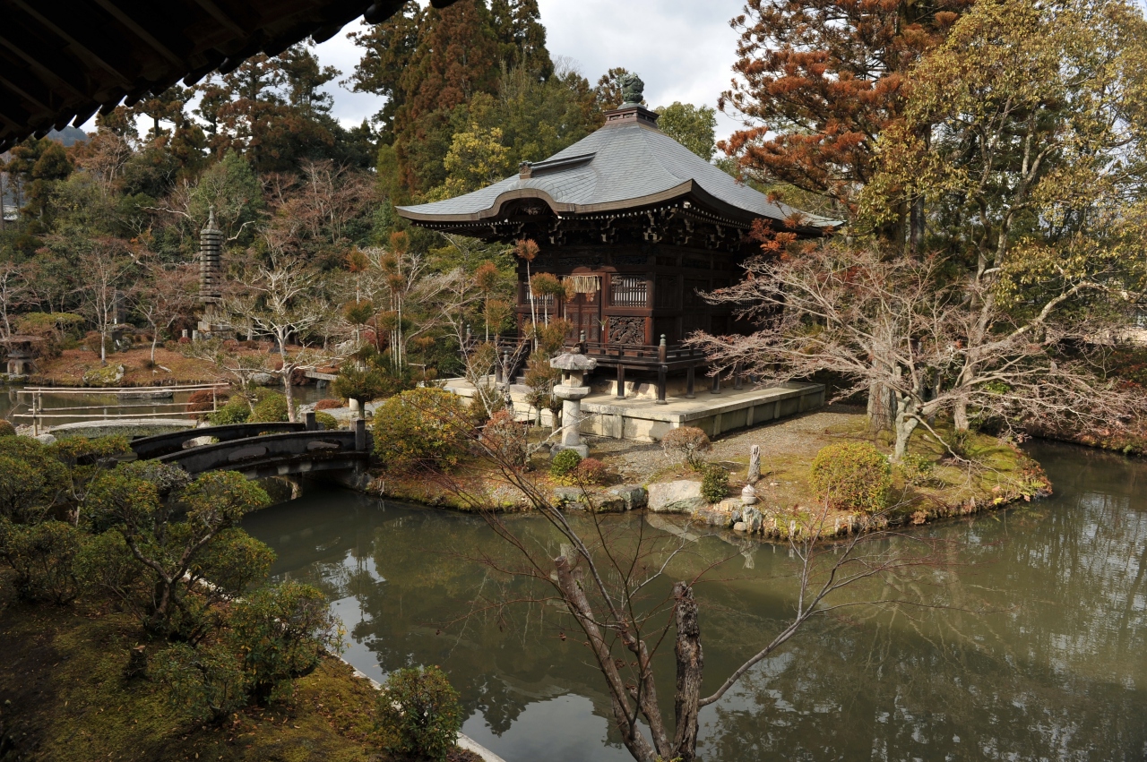 清凉寺本堂の背後に建っており、拝観料を払わないと見ることができないエリアにある。本堂背後には池泉回遊式の庭園が整備されており、中央の島に建築されている。端正な建物で、見事な姿だ。拝観エリアの目玉の一つだ。