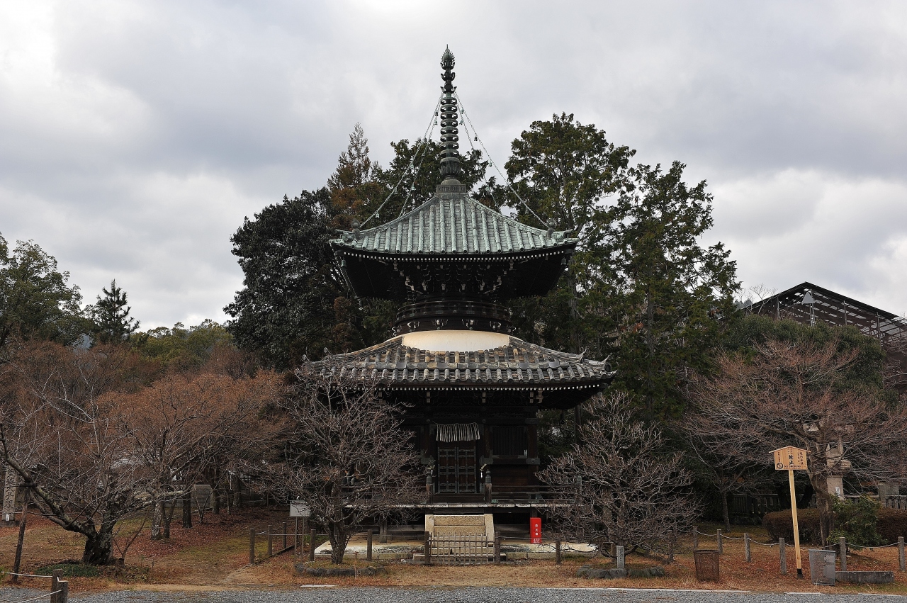 清凉寺では本堂や仁王門と並んで京都府の指定文化財になっている。江戸時代中期の建築で、拝観自由の本堂前の境内に建てられている。軒下の構造も含め、きれいな姿が印象的。周辺には桜や紅葉が植わっており、季節ごとに見栄えがする。