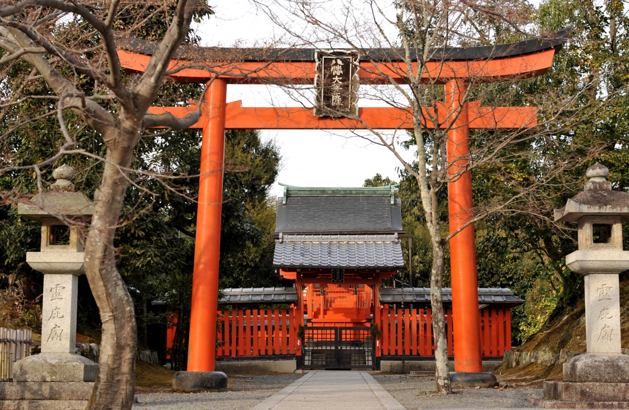天龍寺の総鎮守社。嵐山側から山門をくぐり、参道にずらりと並んでいる境内摂社の一つだ。建立にかかわる伝説があるといい、かつて亀山山頂に設置されていた社で、建立時にここに移された。天龍寺には少ない朱塗りの鳥居、社殿が印象的だ。