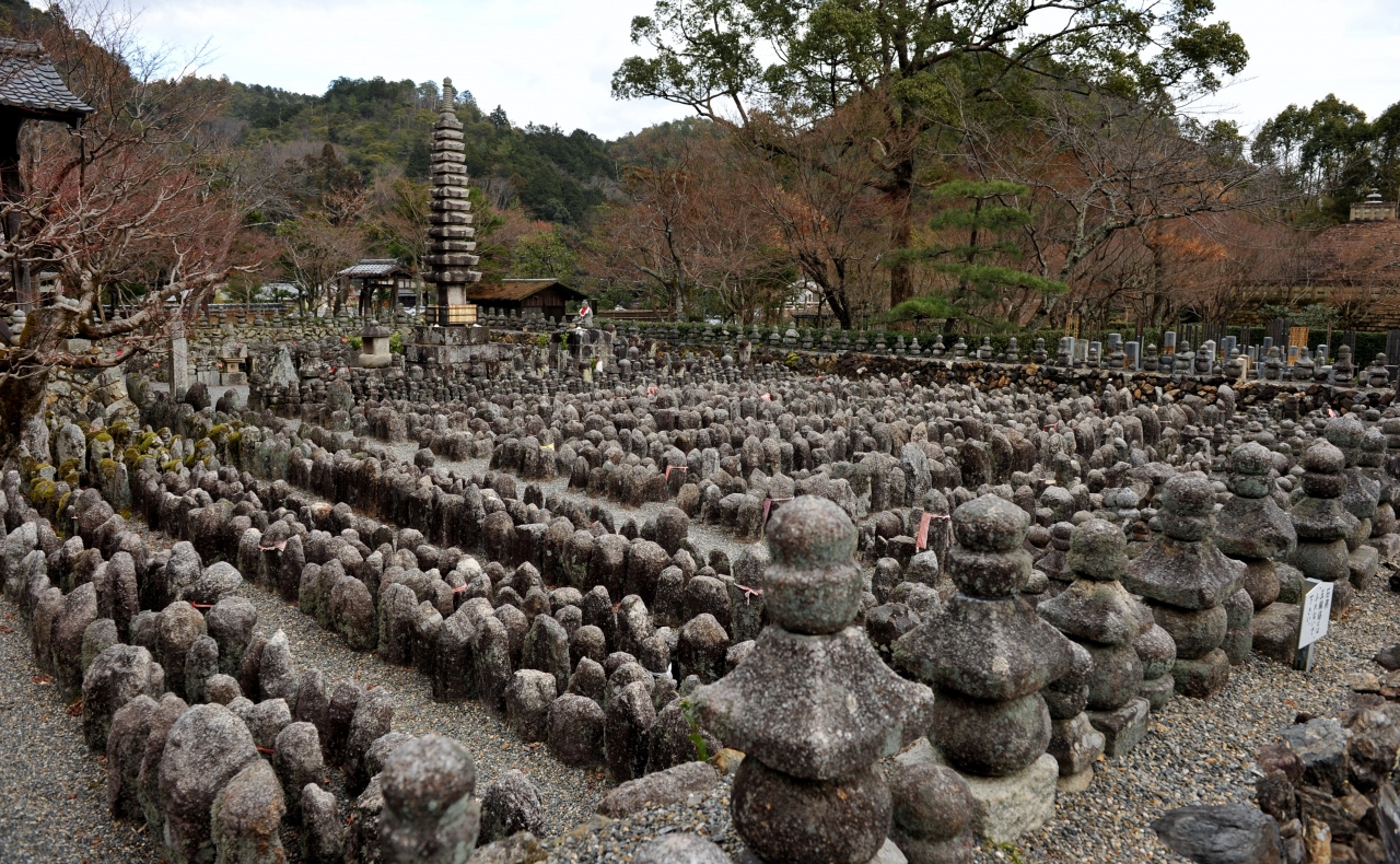 この地に初めて足を踏み入れたのは30年以上前だ。夕日に照らされた五輪塔が無数に整然と並んでいる。その無常が満ちあふれた雰囲気に釘付けになり、しばらくは立ち去り難かったことを覚えている。今回、30年ぶりに訪ねたが、五輪塔が並ぶエリアを少し狭く感じたものの、相変わらずの雰囲気をたたえている。近くの嵐山や嵯峨野は外国人観光客が増加したことで雰囲気が変わってしまったが、念仏寺は不変だ。