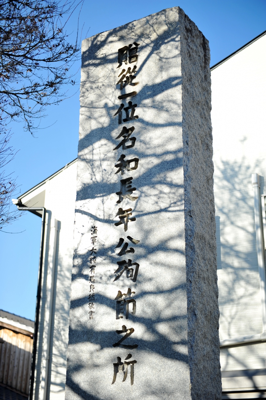 後醍醐天皇による建武の新政で、鎌倉幕府倒幕に功績を残した三木一草の一人である名和長年が討ち死にした場所に立つ。三木は長年のほか、苗字に「き」の字がつく結城親光、楠木正成、一草は苗字に「くさ」の字がつく千種忠顕をさす。長年は功績が認められて伯耆(ほう「き」)守に任じられたことから三木の一人に数えられた。付近は児童公園に整備され、碑も堂々としたものだ。後醍醐天皇が隠岐島からの脱出後、倒幕に呼応して天皇を京都まで送り届けた忠臣とされるが、長年の知名度に比してかなり立派だ。楠木正成と並び、戦前は天皇親政のシンボル的な存在だったのだろうか。石碑の下部にある「船」の石彫は、後醍醐天皇が長年に与えた帆掛け船の家紋だという。