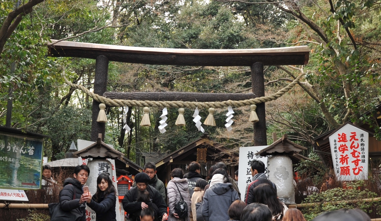 嵯峨野の人気スポットの一つ野宮神社の正面に建つ鳥居だ。境内の説明書きによると、木の皮をはがさず、自然のままのクヌギの木が使われている。古代の鳥居の形を今に残す様式で、3年ごとに建て替えていたという。近年はクヌギの入手が困難になっていたが、高松市の企業から防腐処理をした自然木の寄進をうけた。由緒ある鳥居だが、良縁の神様として大にぎわいの境内の中ではちょっと存在感が低いのが、残念。