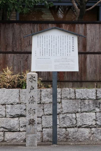 護王神社の北側の道路沿いに石碑が立っている。すぐそばに説明版があり、この場所の価値がわかる。水戸黄門で知られる徳川光圀は大日本史の編纂で知られるが、史料収集のため、京都に数多くの担当者が派遣され、この藩邸で史料を書き写したという。現地は石碑があるのみだが、大日本史の編纂が行われた場所だという付加価値を感じる。