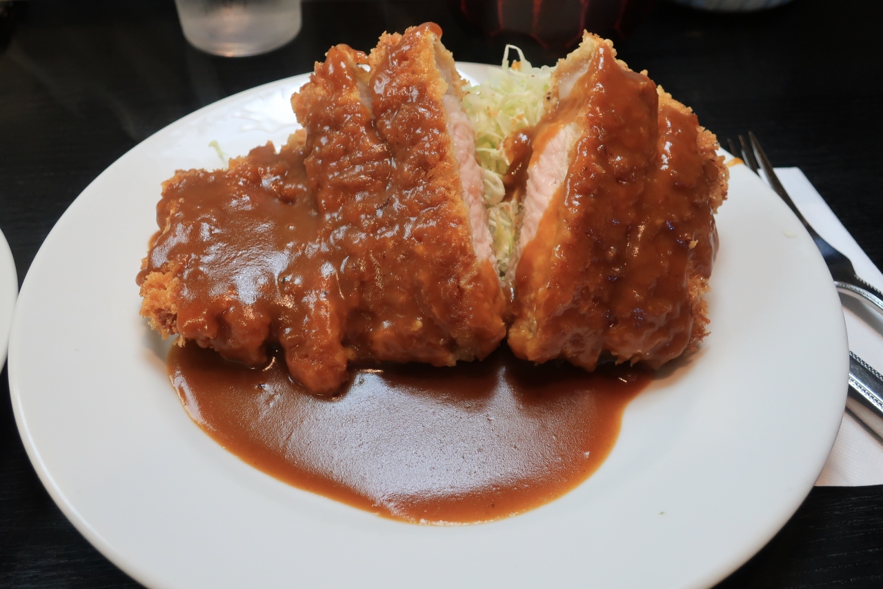 美観地区近くのアーケード商店街にある定食店。何度もこの店の前を通ったことがあるが、いつも人だかりの人気店だ。この日は開店30分前に並び、何とか一巡目に滑り込んで、カウンター席に陣取った。ちょうど、キッチン作業がよく見える席だ。スタッフは全員女性で、すべて役割分担が明確に決まっているようだ。焼く、揚げるなど火の回り、オーダーに沿って肉を分ける担当、衣をつける担当、キャベツを切る人、ホール係など、だ。人気店に共通する独特のマニュアルがあるようだ。オーダーは名代とん定、奥さんはミニとん定。デミグラスソースで食べるトンカツだ。期待通り、軟らかい肉で満足した。いい意味での家庭料理で、哲学的に語るタイプではなかろう。