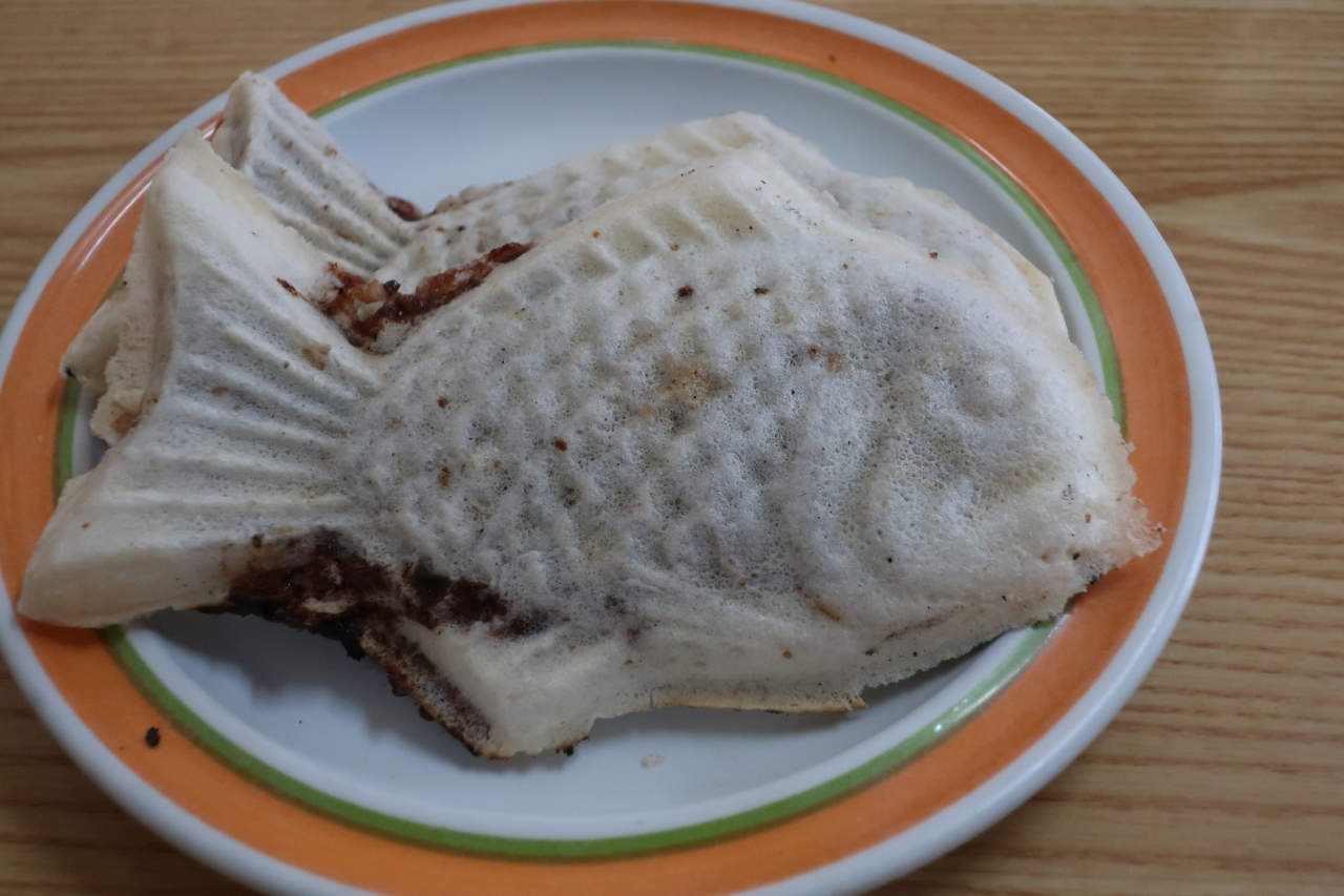 いかにも<昭和>という感じのたい焼き屋さんだ。倉吉でミニチュアハウス展が開かれた時、真っ先に題材になったことがあるほど<昭和>。数枚を一度に焼くのではなく、一枚ごとの型で焼くので<天然もののたい焼き>と呼ばれている。白壁土蔵群を中心とする伝統な町並みの一角にあり、散策がてら寄るのにピッタリだ。10年ぶりに行ったが、以前と変わらない味で感激した。相変わらず一枚ずつ一組の鉄板で焼き上げる<天然もの>で、店主のたい焼きを焼く姿も観光資源だ。たい焼きのほか、大判焼き、タコ焼きがある。中にはイートインというか食堂といってもいいテーブルとイスがある。