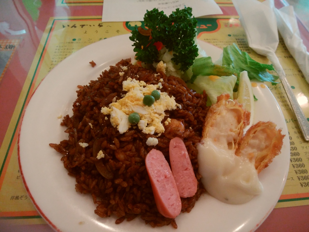 岡山名物のえびめしが売りだ。TVの特集で知ったが、もともと東京のあるレストランの従業員が故郷の岡山で店舗展開し、えびめしをもたらしたという。「いんでいら」はそのうちの一店だろう。メニューはランチ、スープ、サラダ、スパゲッティ―、ピザ、カレー、ドリンクとファミリーレストラン的な展開だ。えびめしは、というとカレーに分類されていた。ソース味の焼きめしといったところだろうか。単品が620円、カニコロッケをトッピングすると830円、ハンバーガーをトッピングすると935円となる。店は地域スーパーの1階にあるタイプで、テーブル席が店内に広がっている。