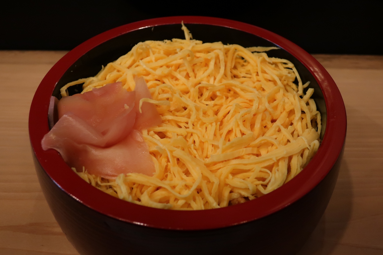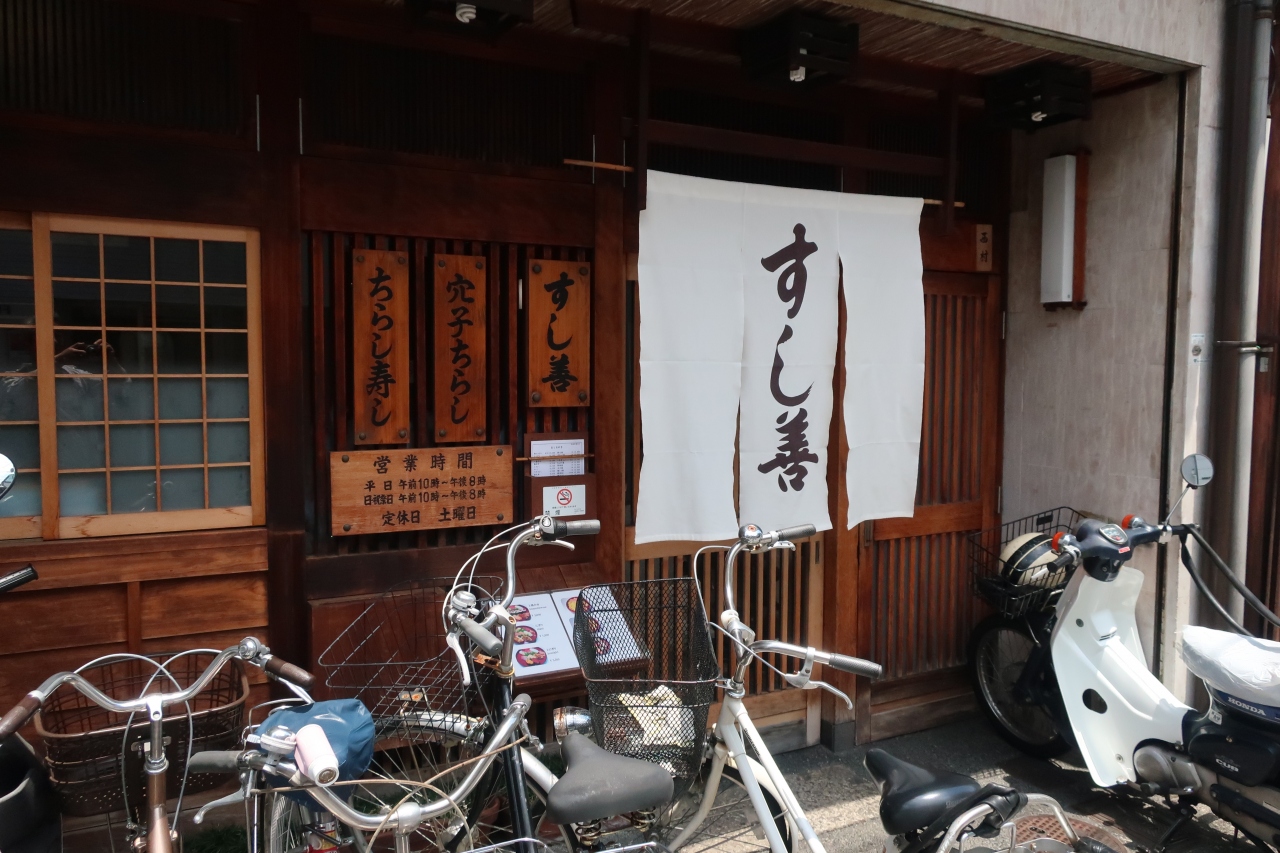 三条新町という京都の真ん中にあるが、地域型のすし店だ。奥さんがインターネットで見つけたすし店で、ここのちらし寿しが評判だという。午前11時ごろに入店したが、昼食の出前がひっきりなしだった。奥さんはちらし、当方は穴子のちらしを注文した。何といっても特徴は錦糸卵だろう。ネタを埋め尽くすように黄色い卵が敷き詰められているのだ。錦糸をかき分け、かき分けて穴子やネタの海産物を探し出してほお張る。そんな感覚だ。個人的にはネタが色々のちらしの方がちらし寿司らしくて好きだが、アナゴも満足度は高い。価格的にも、場所的にも気軽にランチが楽しめる店だった。