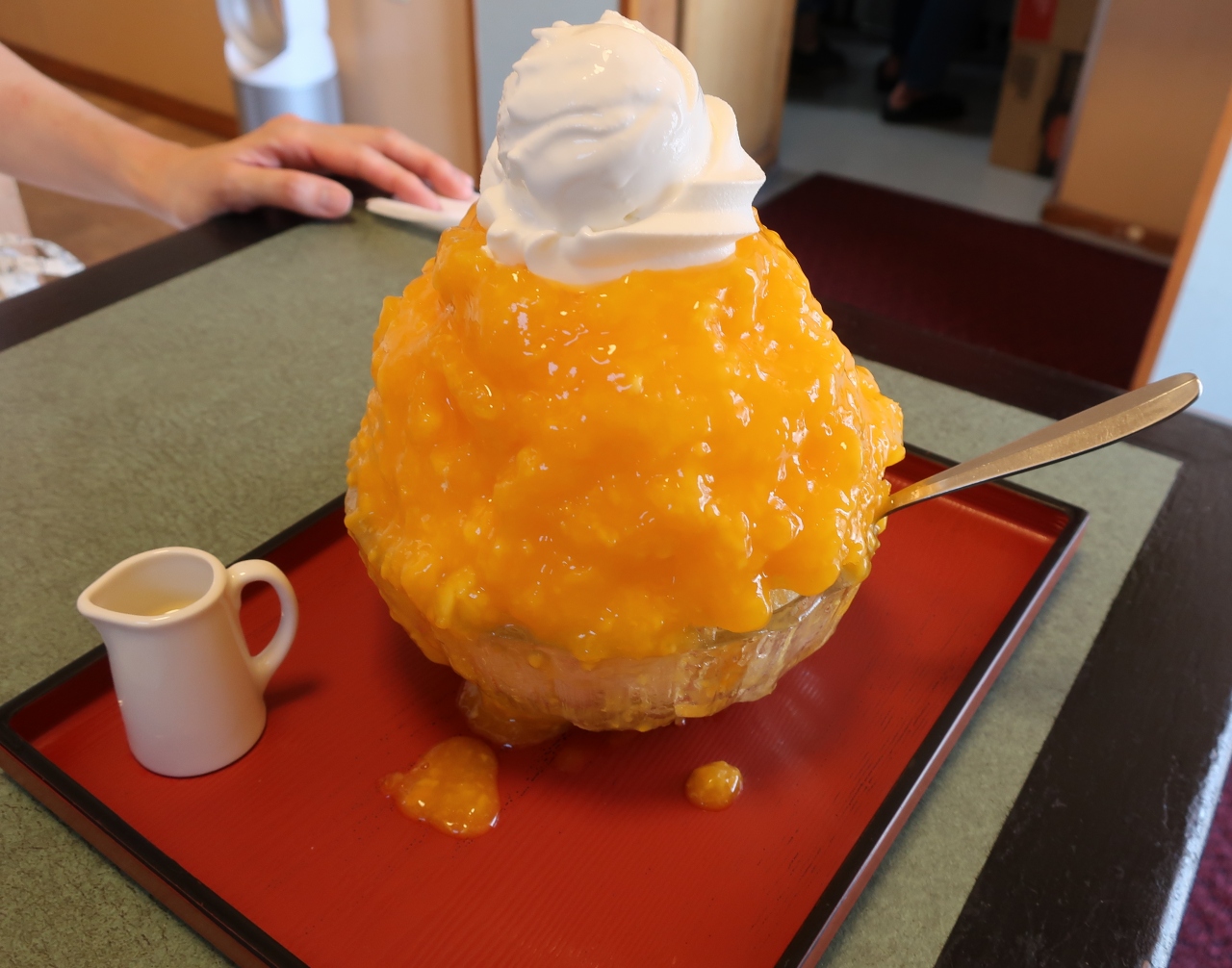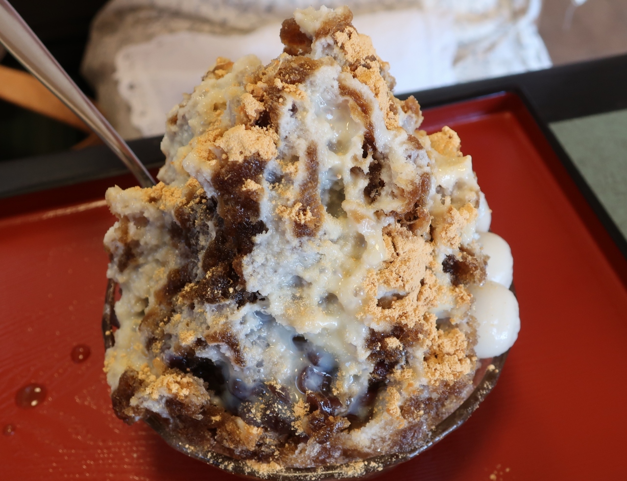 イマドキのスイーツではなく、甘味処という風情が漂うお店だ。お目当てはかき氷。当方はマンゴー、奥さんは黒糖時雨スペシャルをオーダーした。まずは、ボリューム。これでもかと氷を盛って、できるだけソースをかけて、白玉を「埋め込む」という感じで、お盆にまでこぼれているほどだ。黒糖時雨スペシャルは黒糖と時雨シロップ、ミルクなどが絶妙に混ざっており、ゴージャスな複雑な味だ。対してマンゴーはマンゴー一本やり。てっぺんのアイスがおいしい。ああ、満足した。夏メニューにはない、ホットケーキも食べに来たい。