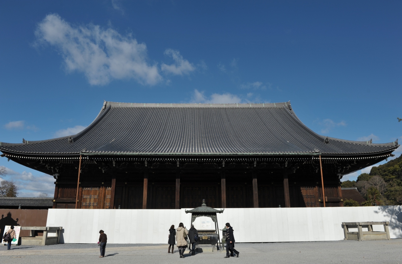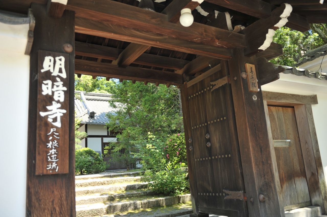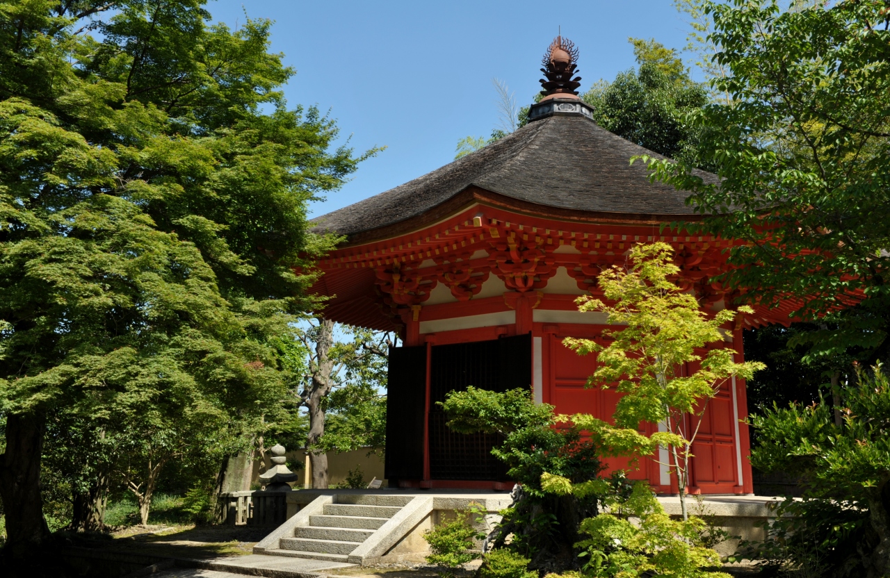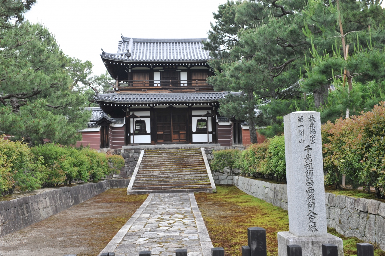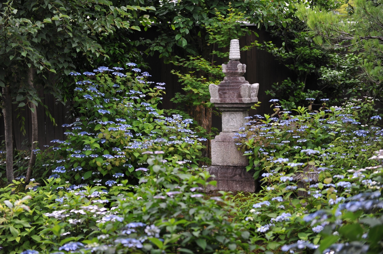 東福寺の塔頭にも同名の寺院があるが、こちらは建仁寺の塔頭だ。寺の案内には<甘茶の庭>と表記されている。恥ずかしながら花祭りでお釈迦様の像に甘茶をかけるシーンを想像してしまった。甘茶とはアジサイの変種で、ガクアジサイにそっくりの花だ。本堂から眺める枯山水庭園にはこの甘茶がたくさん植えられている。この庭が味わい深く、沙羅双樹やかりん、松などでお釈迦様の生涯を表現しているという。この日は甘茶が咲いたばかりで参拝客が多く断念したが、茶室での喫茶や写経なども受け付けていた。お堂の中央に展示されている毘沙門天立像が手に持っている水晶玉には最澄が持ち帰った仏舎利が納められており、近くで見ることができるが、うまく見つけられなかった。