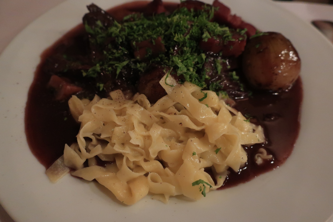 いい場所だ。寺町二条の角で、都心だが騒がしくない。この日はディナーで訪問。奥さんと二人で前菜+主菜+デザートで2800円のセットを頼んだが、プナードとオリーヴがサービスでついた。自分で選んでおきながら不覚にもメニューを忘れたが、リヨン風サラダとタイのカルパッチョ、メインは子羊とジャガイモの煮込み、牛肉の赤ワイン煮込みだったと思う。量は十分だった。足りない向きにはもう一品魚料理を足した4100円のコースもある。雰囲気もどことなくざっくばらんでいい。「ブション」とはリヨンの郷土料理を提供する大衆食堂をさす仏語らしいが、なるほどと思った。