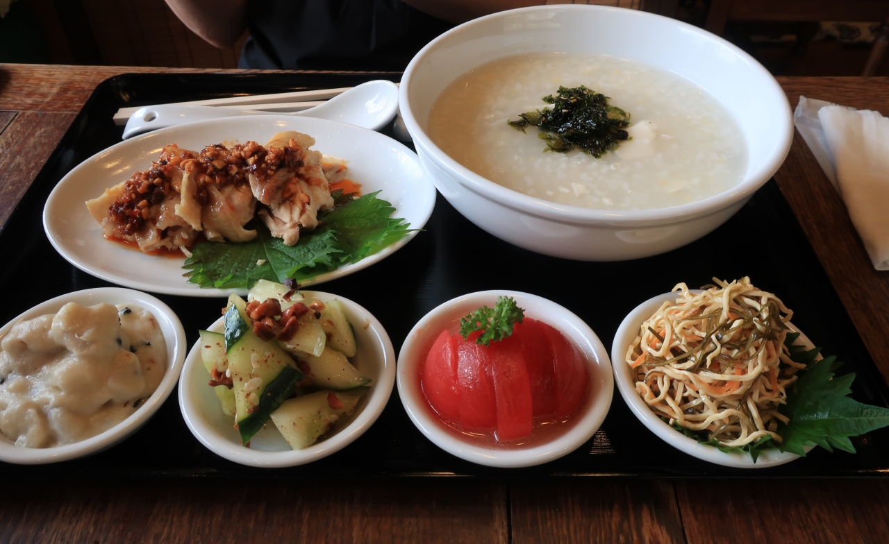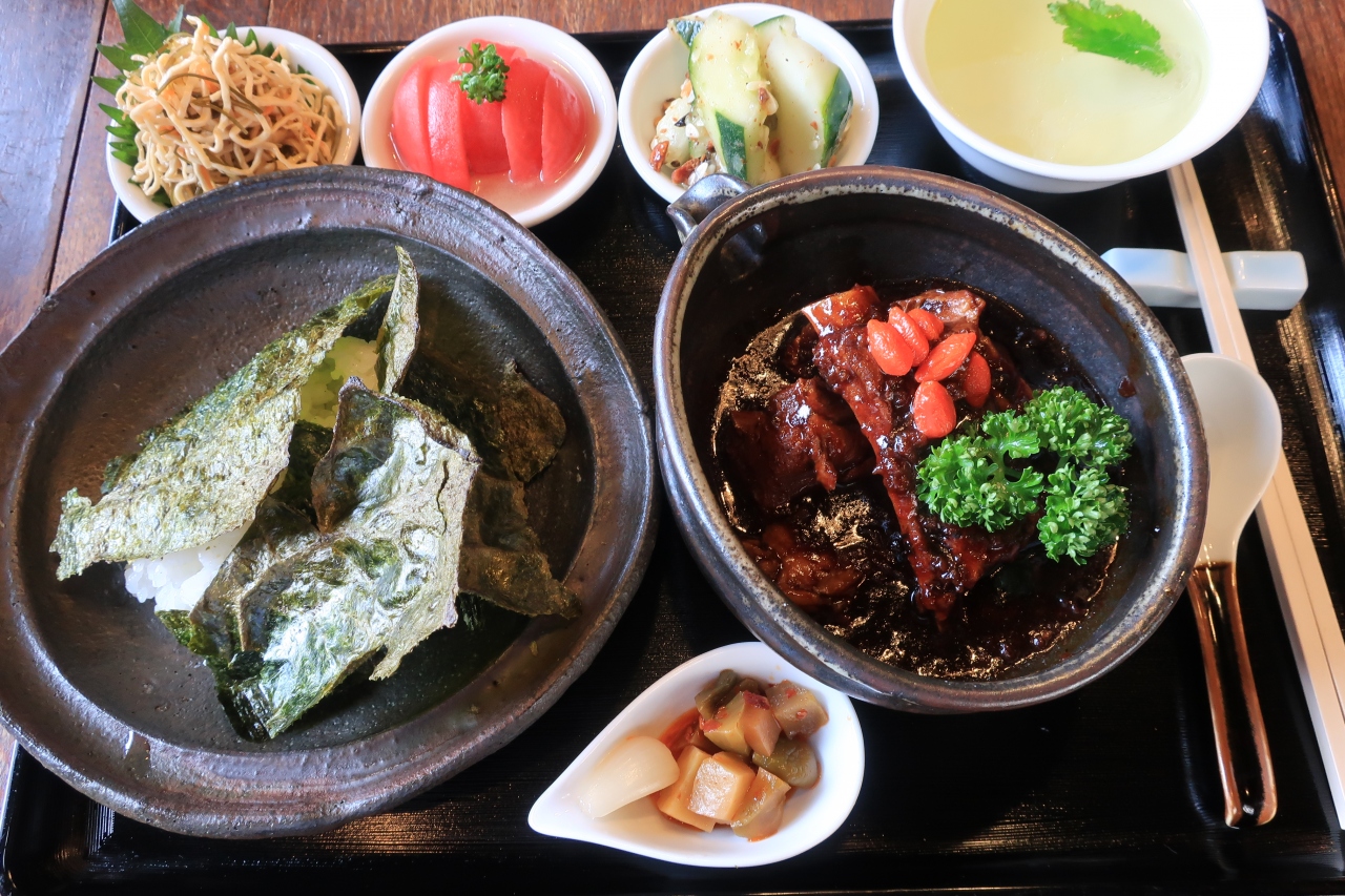 JR宇治駅近くの宇治橋通商店街から少し入った所にある。上林春松本店の近くだ。ランチの予約は2回転制で、この日は午前11時半からのランチを予約した。毎月、ランチのメニューが異なっており、6月は「上海粥&よだれ鶏」「三元豚と焼玄米の蜂蜜煮」「蘇州ワンタン&蓮の葉おこわ」など4種類だ。奥さんは上海粥、当方は三元豚をオーダーした。メインの料理が二つ並び、周囲をスープやサラダなどの小皿が取り囲んでいる。なかなか幸福感を感じる「絵」だ。毎月変わるならばメニューをあまり説明しても意味はないかもしれないが、体にいいものは美味しいということを実感した。また、食前のジャスミンティー、デザートの杏仁豆腐も秀逸だ。