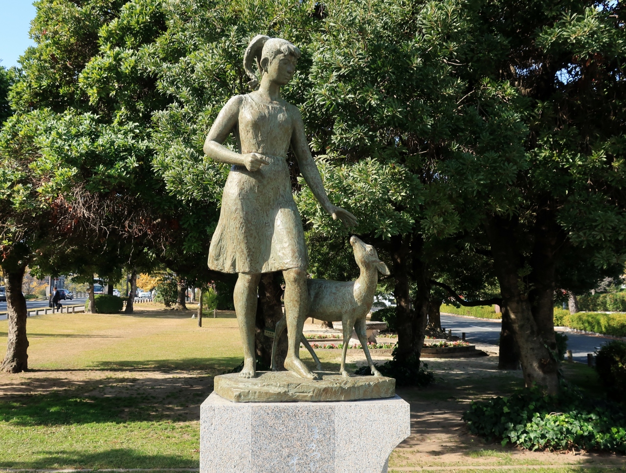 平和資料館前にある。JR広島駅前など市内各地に像を残している広島県出身の彫刻家・円鍔勝三の作品だ。小鹿に少女が左手をさしのべている。広島南ロータリークラブ創立10周年記念の像だという。台座には日本で初めてノーベル賞を受賞した湯川秀樹博士の短歌「まがつびよ ふたたびここに くるなかれ 平和をいのる 人のみぞここは」が刻まれている。「まがつび」は災害・凶事を起こす神だ。このエリアは直截的な慰霊碑ではなく、テーマ性を持った平和を表現する像が多い。