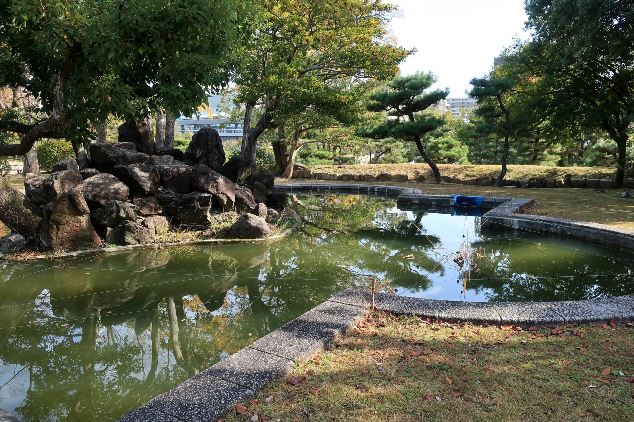 広島城の東側の裏御門跡近くに「歩兵第11連隊跡」の石碑などがあるポケットパークが設置されているが、「池田勇人君像」はそのパーク内に置かれている立像だ。第58代内閣総理大臣。広島県竹原市の出身で、竹原には和装の池田像があるはずだ。設置後、50年を経て傷みが目立ったため、遺族の寄付により、2015年に2代目の像に更新された。少し気取って歩き出すような姿。台座に書いてある像の呼称が「君」なのが珍しい。政治の師匠である吉田茂が揮毫したから「君」に落ち着いたのだろうか。