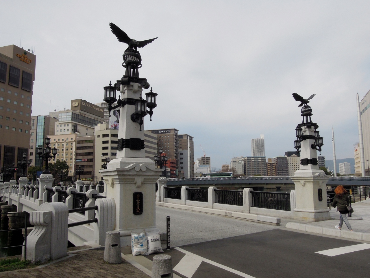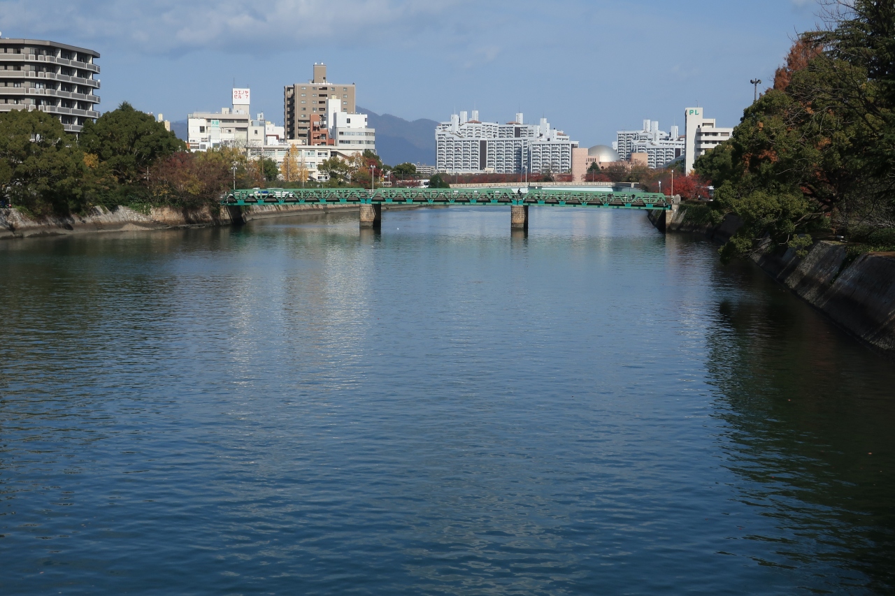 放水路ができると川の名前が変わるというのはよくある例だ。淀川でも放水路が淀川と呼ばれ、大阪城そばの河川は大川になった。米子市では加茂川の放水路が加茂川となり、以前の河川は旧加茂川と呼ばれている。ここも放水路が太田川となり、旧太田川は本川と名称を変えた。ただ、現地の標識には本川と旧太田川の両方が書いてある。「太田川」と言われたら本川か放水路かと確認しなければならないかもしれない。平和大通りから眺めたが、平和記念公園を挟んで反対側の元安川がレジャー的に整備されているのに対し、こちらはビジネス街を流れるといった感じだ。
