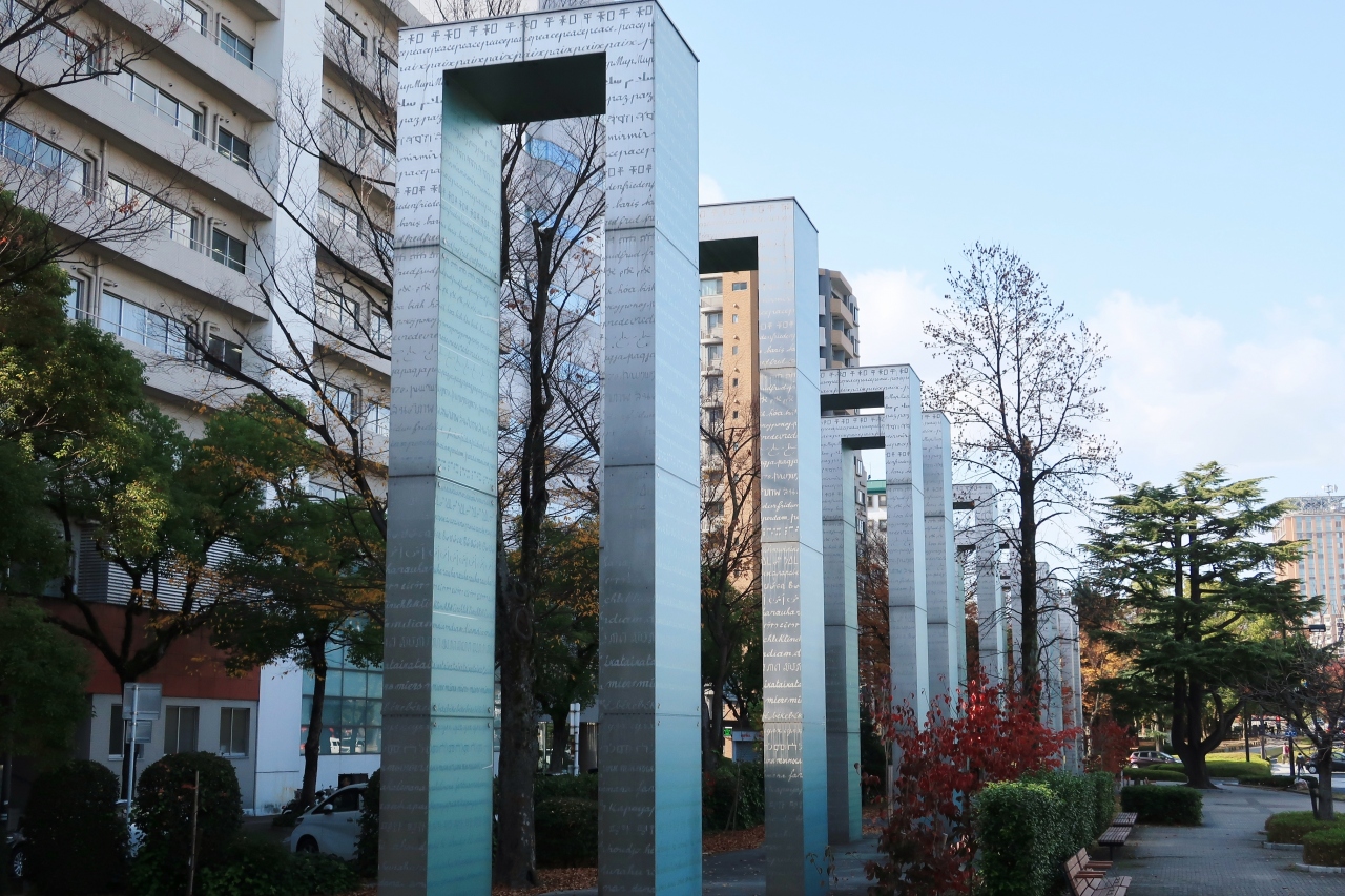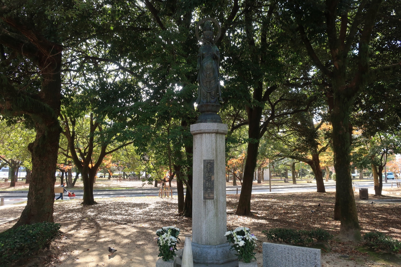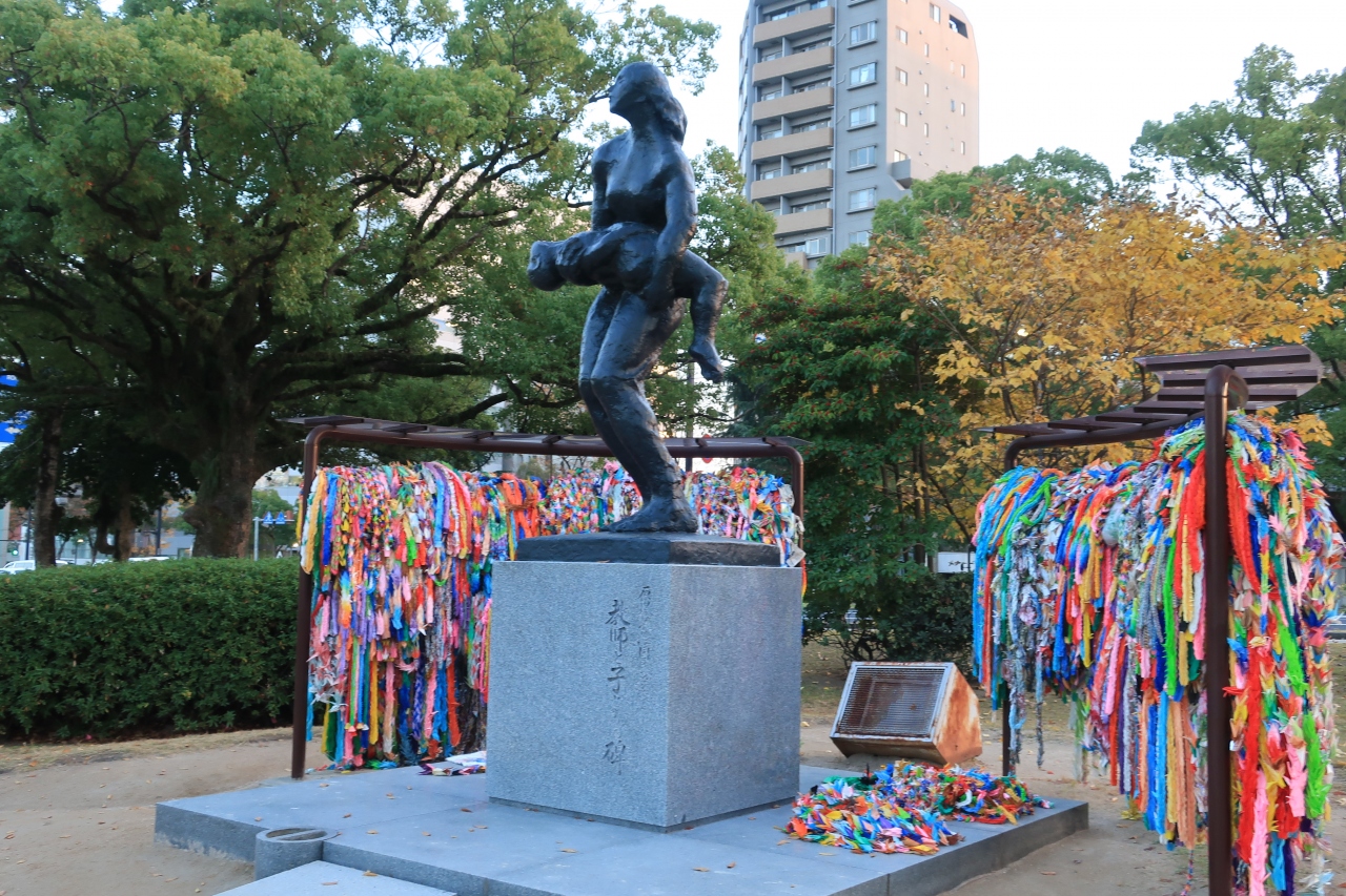 原爆で被災し、ぐったりした教え子を抱えた女性教師が空を見上げている像だ。子供はもしかしたら絶命しているかもしれない。現実、原爆が投下された折、幼いため疎開しなかった子どもと、いわゆる建物疎開、延焼を防ぐためにあらかじめ建築物を壊す作業に従事していた学生たちが被災したという。その数は教師が200人、子供が2000人だったとされる。平和大通りに近いグリーンベルトの中にあるが、多くの折鶴がとても目立つし、とても悲しい。