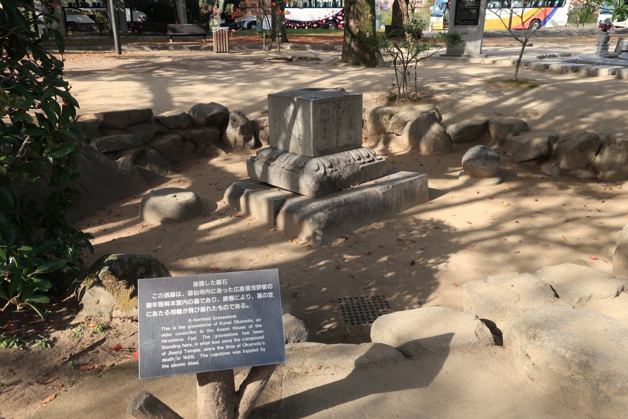 韓国人犠牲者慰霊碑の近くにある。説明版があるのでかろうじて原爆遺構とわかるが、五輪塔がばらばらになった姿だという。この場所には慈仙寺があり、ばらばらになった五輪塔は広島藩御年寄の岡本宮内のものだ。また、この周囲は被爆当時の地面をそのままとどめている。平和記念公園は盛り土して築かれたが、この周囲は石で囲んで池の底のように地面を残した。崩壊した五輪塔にも被爆の悲惨さを見いだした人々の思いが伝わる場所だ。