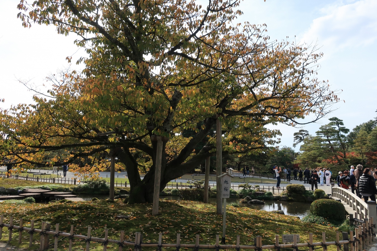 今ある旭桜は二代目だという。初代は藩政期に大木のヤマザクラを加賀藩の家老が献上して移植されたものだという。見事な枝ぶりだったらしく、昭和初期に枯れるまではこの桜が兼六園を代表する景観だったという。その後、ひこばえが大きく成長し、現在の二代目に就任した。DNAは一緒なのだから、初代でもいいような気がするのだが。訪れたのが紅葉の時期で花見はできなかったのは残念。現在は通行できない雁行橋とのコンビが兼六園の象徴だっただけに、こちらのコンビ復活も望みたい。