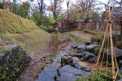 惣構は城下町を囲い込んだ堀や土居などの防御施設を指す。秀吉が造った京都の御土居が典型的な例ではないか。金沢城には内、外二重の惣構が築かれたという。主計町緑水苑が整備された際に、かつて築かれた西内惣構の堀をわかるように整備。堀の幅をこれまでの約2メートルから、藩政期当時に合わせて約10メートルに拡大し、土居を復元。江戸時代の規模に近づけたという。現地はポケットパーク的な雰囲気だが、防御施設の断面があるというのはここが城下町だと改めて実感させる。