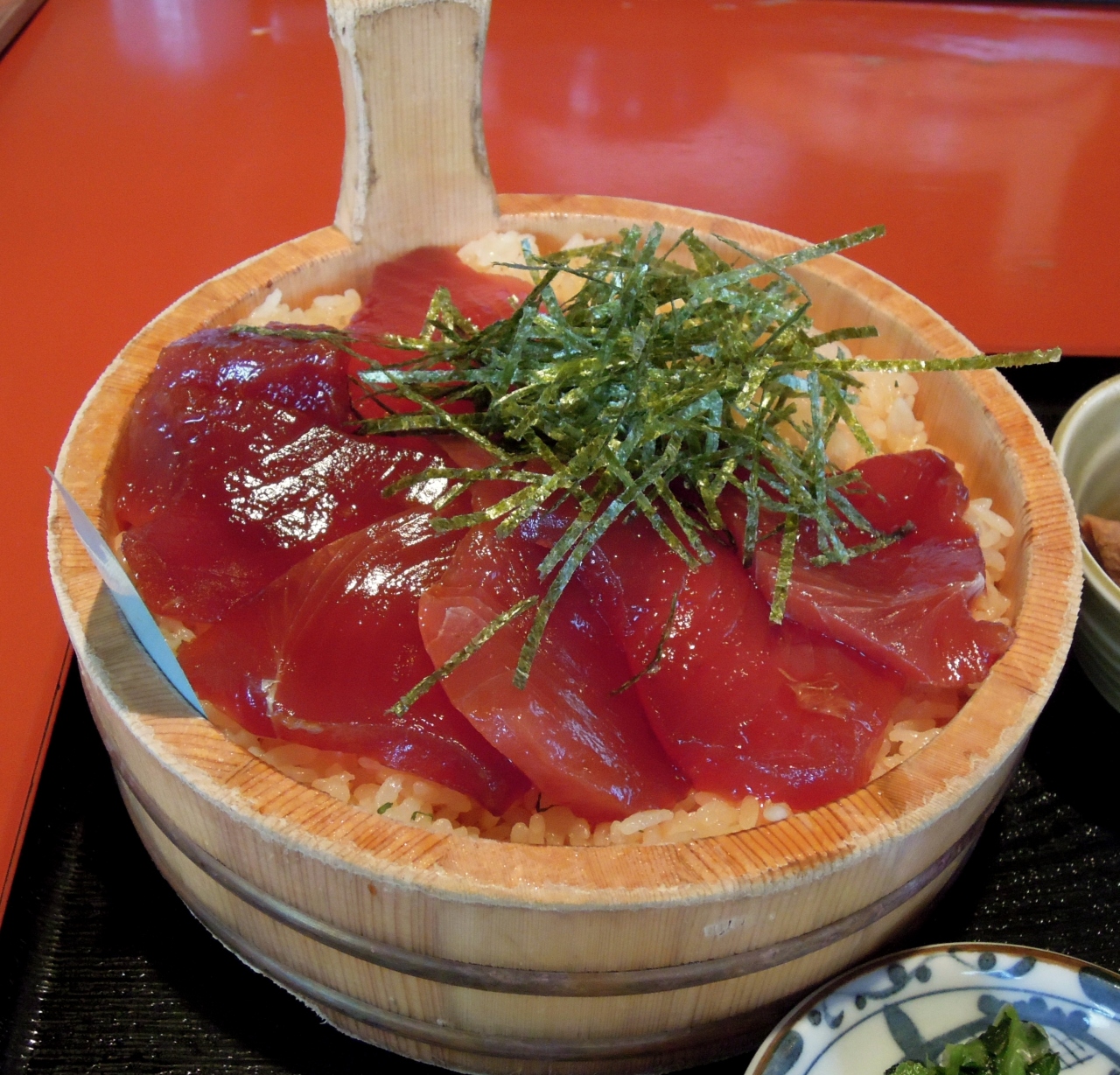 休日の昼間はとんでもない待ち時間が発生する人気店だ。しかし、一度は行ってみたい。朝ごはんに赤福を食べ、開店と同時にこの店に並ぶ作戦を立てた。ネット情報によると、開店時間は午前11時と10時半の二通りがある。9時に赤福を食べ終え、その足で店先にいたすし久の従業員に聞いてみた。「きょうは10時に開店します」。うーん。結局、一度は神宮に向かい、10時に間に合うように取って返して開店前から並んだ。5組ほどがいたが、まだ10時だ。さすがにすんなりと入れた。座敷に座ってシンプルな手こね寿司をオーダー。持ち手がついた桶に入った漬け丼のような料理がやってきた。ものはカツオだが、見た目はマグロの漬け丼のよう。独特の醤油というか、タレが個性なのだろう。おいしくご飯を頂いた。